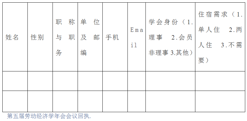 (2)填写下面的回执表,并邮件发送至cale2020@163.com第五届劳动经济学会年会报名回执