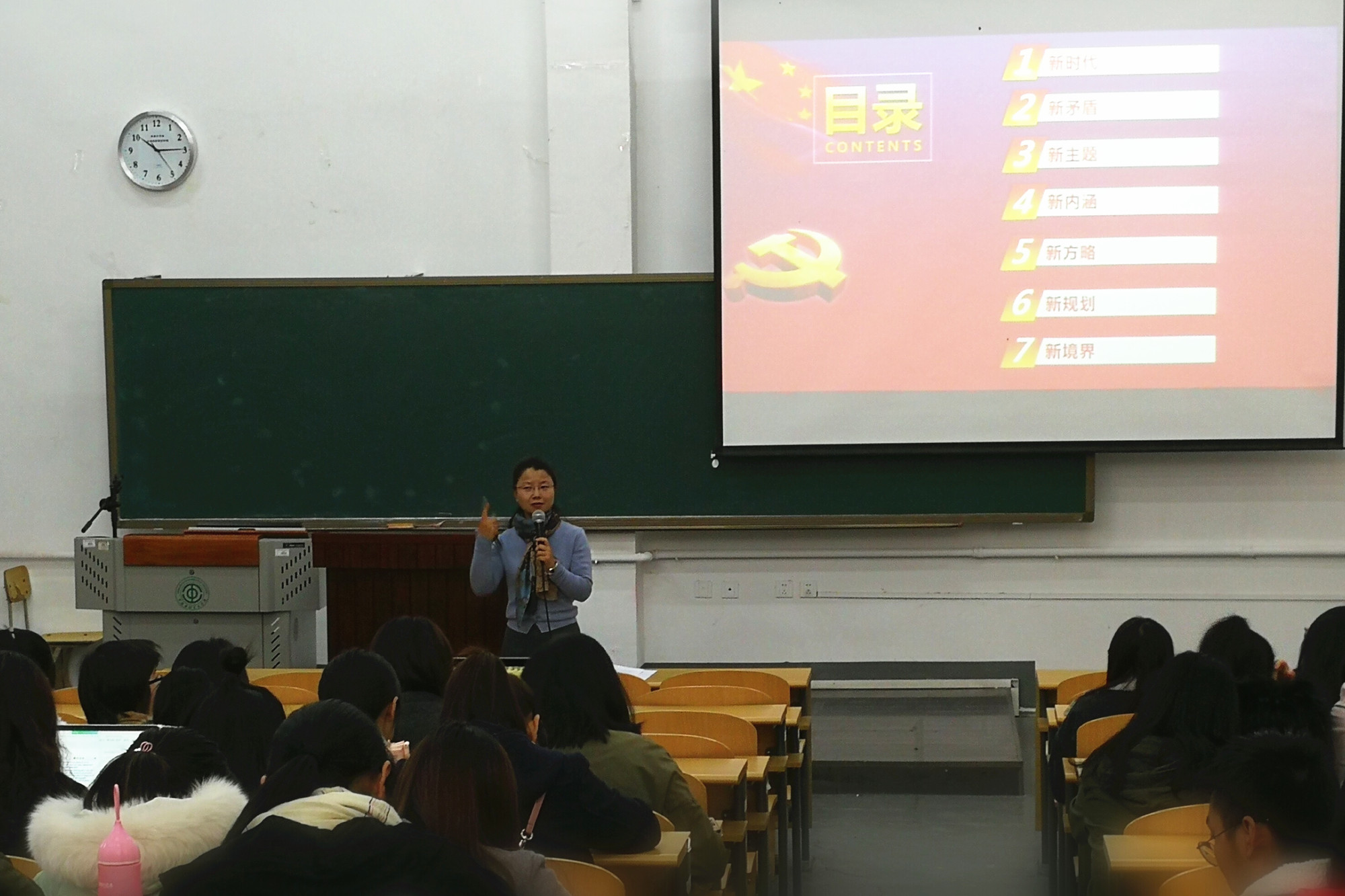 课堂上,老师们共用同一课件,从新时代、新矛盾、新主题、新内涵、新方略、新规划、新境界七个方面,结合集中讲授、视频播放、分组讨论、心得分享等授课方法,深入解读党的十九大报告,生动宣讲党的十九大精神,以学生喜闻乐见的形式,推动十九大精神进课堂、进头脑,宣讲效果明显。2017级工商管理班学生支元熙从身边的小事着眼,分享了党的十八大以来,自己在衣、食、住、行等方面的变化和感受;2017级新闻2班的朱开宇同学从行业着眼,列举高铁、手机支付等新成果,表达了为国家经济建设和社会发展取得历史变革而感到自豪的激动心情。同时,通过理论学习,同学们充分认识到自己在实现“两个一百年”奋斗目标中肩负的重任,纷纷表示将深入学习党的十九大精神,将个人发展、理想追求置身于新时代中国特色社会主义建设的大时代中,在实现富强民主和谐美丽的现代化强国和中华民族伟大复兴中激扬青春,追寻人生价值。