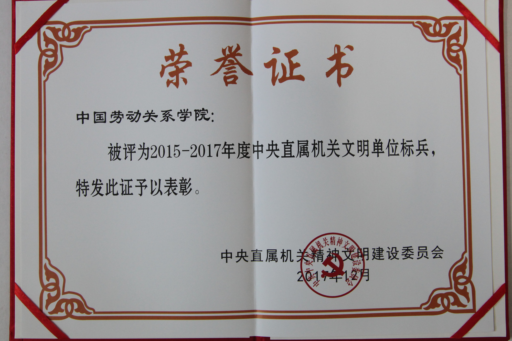 学校荣获2015-2017年度“中央直属机关文明单位标兵”称号