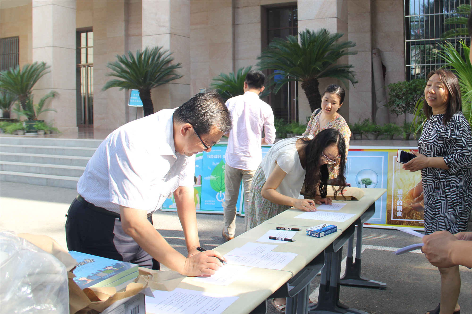 活动围绕节水、节电、节能、节粮及垃圾分类等相关知识随机出题并现场发放问卷答题,回答正确的教职工便可获得环保袋小礼品。活动中,学校还以部门为单位配发了《垃圾的故事》宣传册,普及垃圾分类处理相关知识,引导大家树立保护环境、珍惜资源的理念。