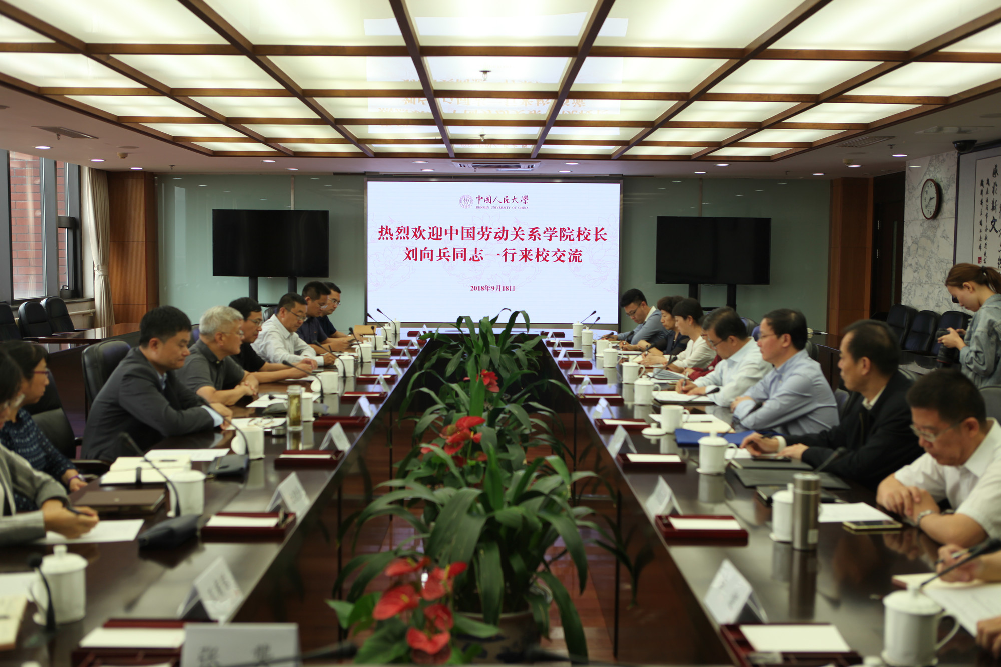 9月18日下午,刘向兵校长、吴万雄副校长带领相关职能部门负责人一行10人赴中国人民大学交流座谈。中国人民大学党委常务副书记张建明携相关部门负责人热情接待了刘向兵校长一行。