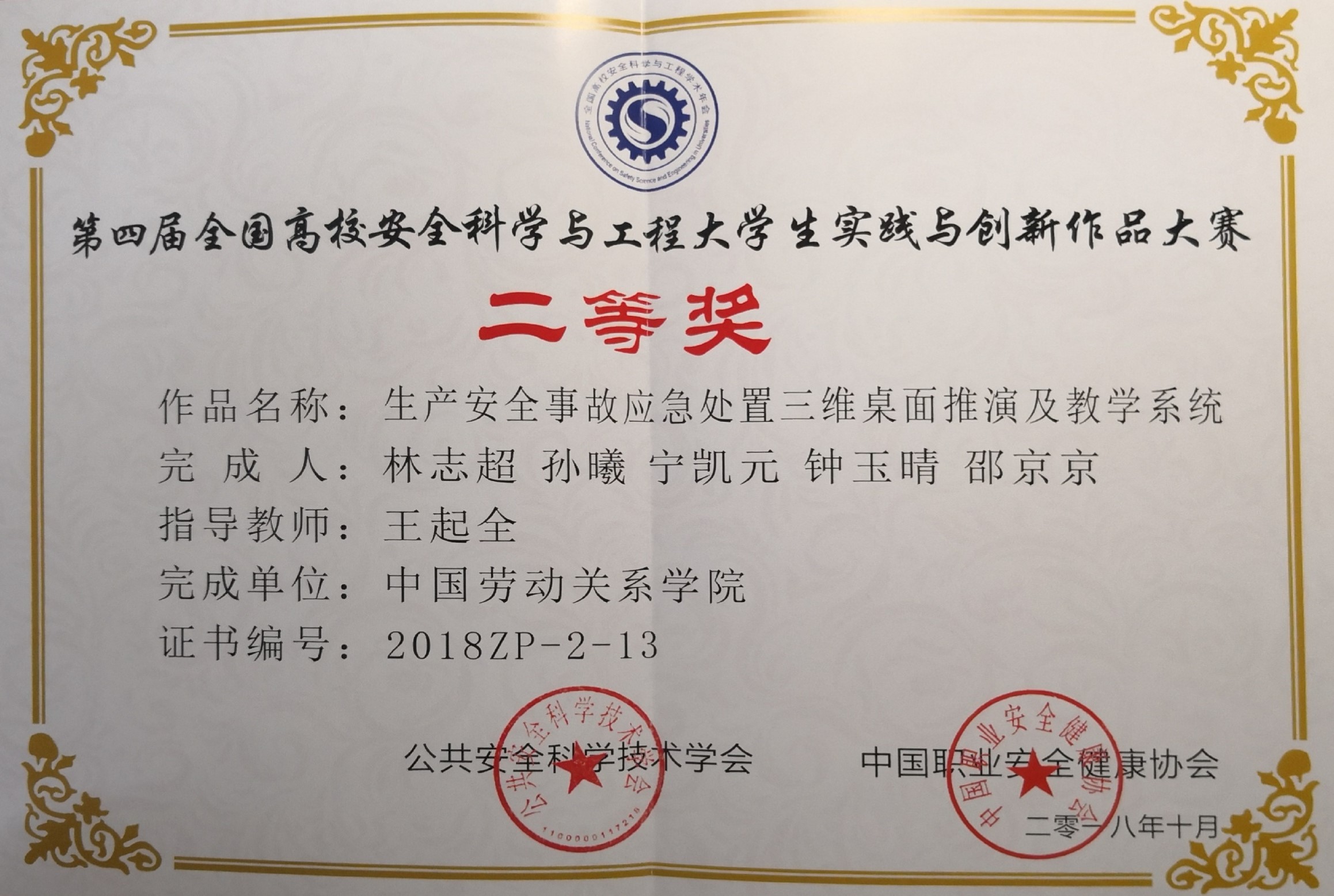 10月12日至14日,第四届“全国高校安全科学与工程大学生实践与创新作品大赛”颁奖典礼在中国科技大学举行。ac米兰安全工程系学生张以波、林志超、孙曦、宁凯元、邵京京、钟玉晴等在指导教师王起全副教授的带领下参赛,并凭借作品“生产安全事故应急处置三维桌面推演及教学系统”荣获大赛二等奖。