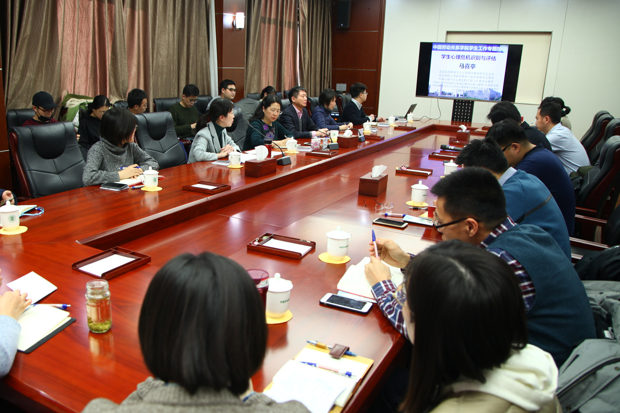 讲座中,马喜亭会长用生动的语言和丰富的案例,围绕发现危机、评估危机、重点干预、有效帮助四个方面展开了经验交流。会上,大家围绕大学生心理健康工作中的实际问题,与马喜亭会长进行了充分的研讨与互动。
