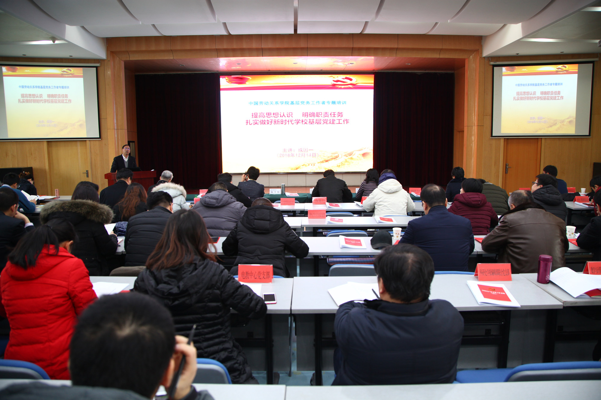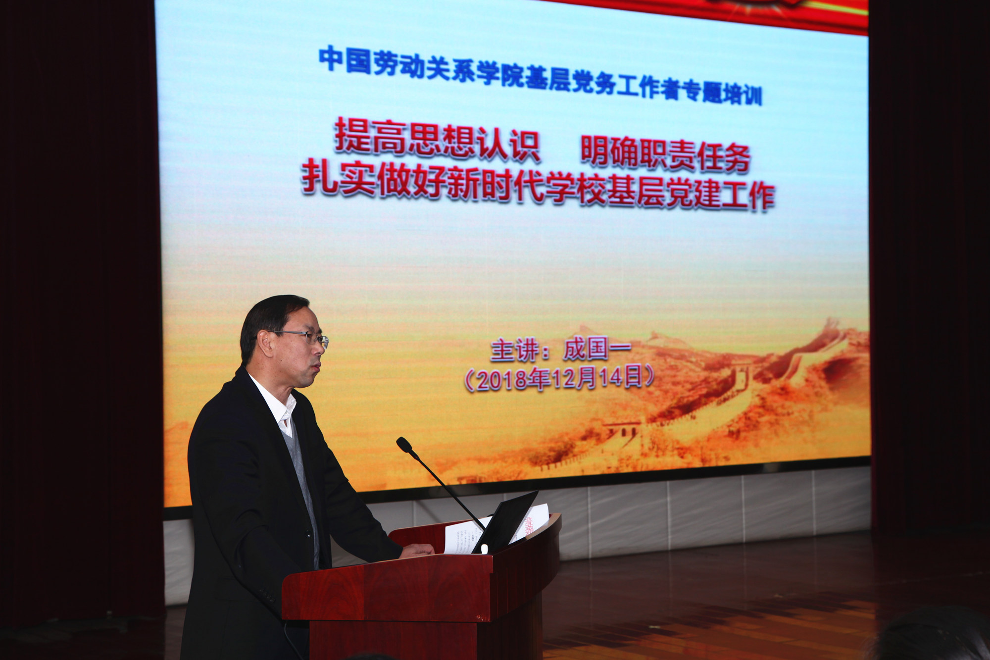 12月14日上午,学校在北京校区508教室开展基层党务工作者专题培训第三讲。党委副书记、纪委书记成国一以《提高思想认识 明确职责任务 扎实做好新时代学校基层党建工作》为题做讲座。学校党委委员、纪委委员,各党总支书记(副书记)、总支委员,在职教工党支部书记(副书记)、支部委员,学生党支部书记、支部委员及部分职能部门全体工作人员共计110余人参加了培训。讲座由党委常委、党委组宣部(统战部)部长(兼)杨冬梅主持。