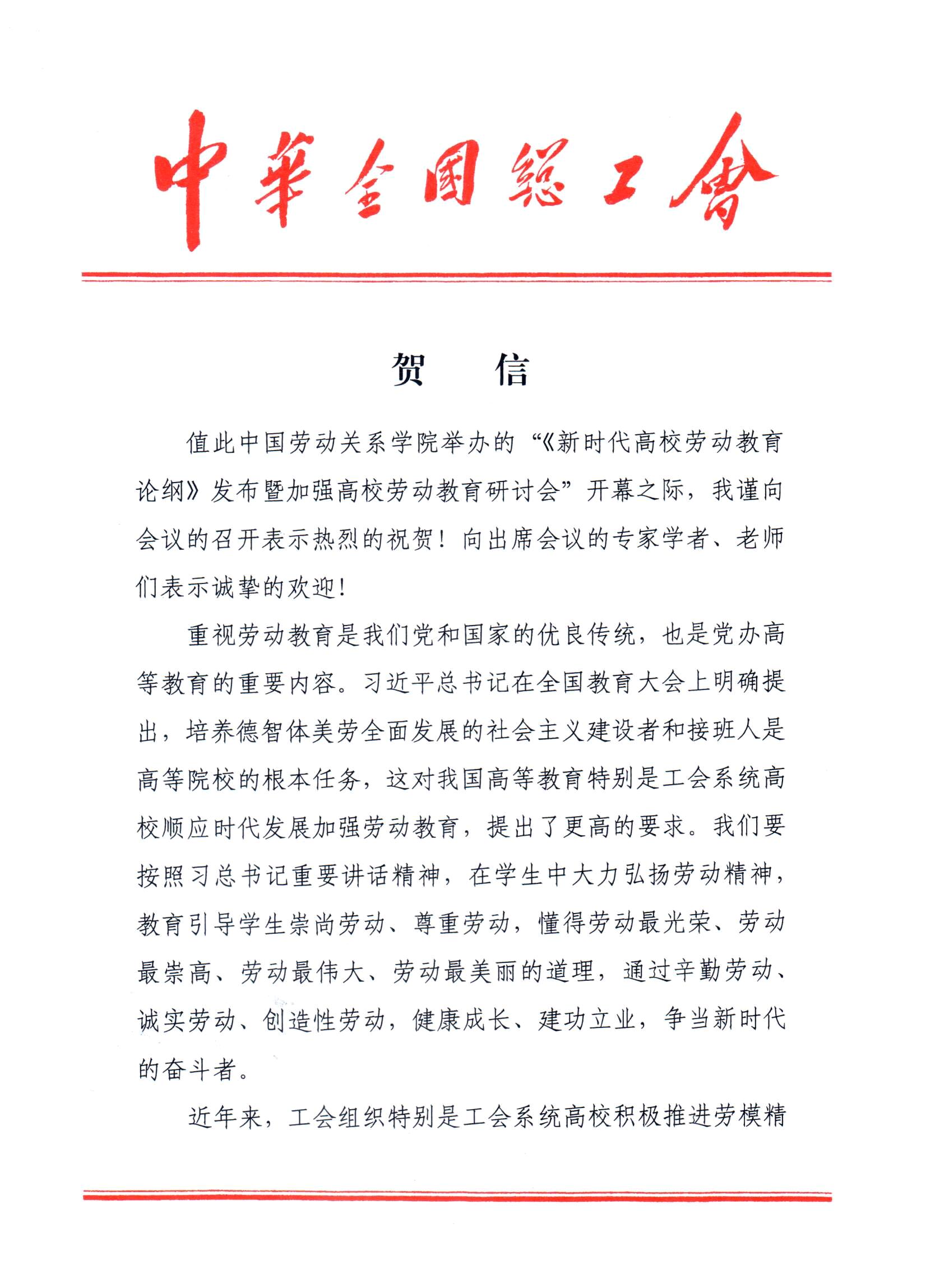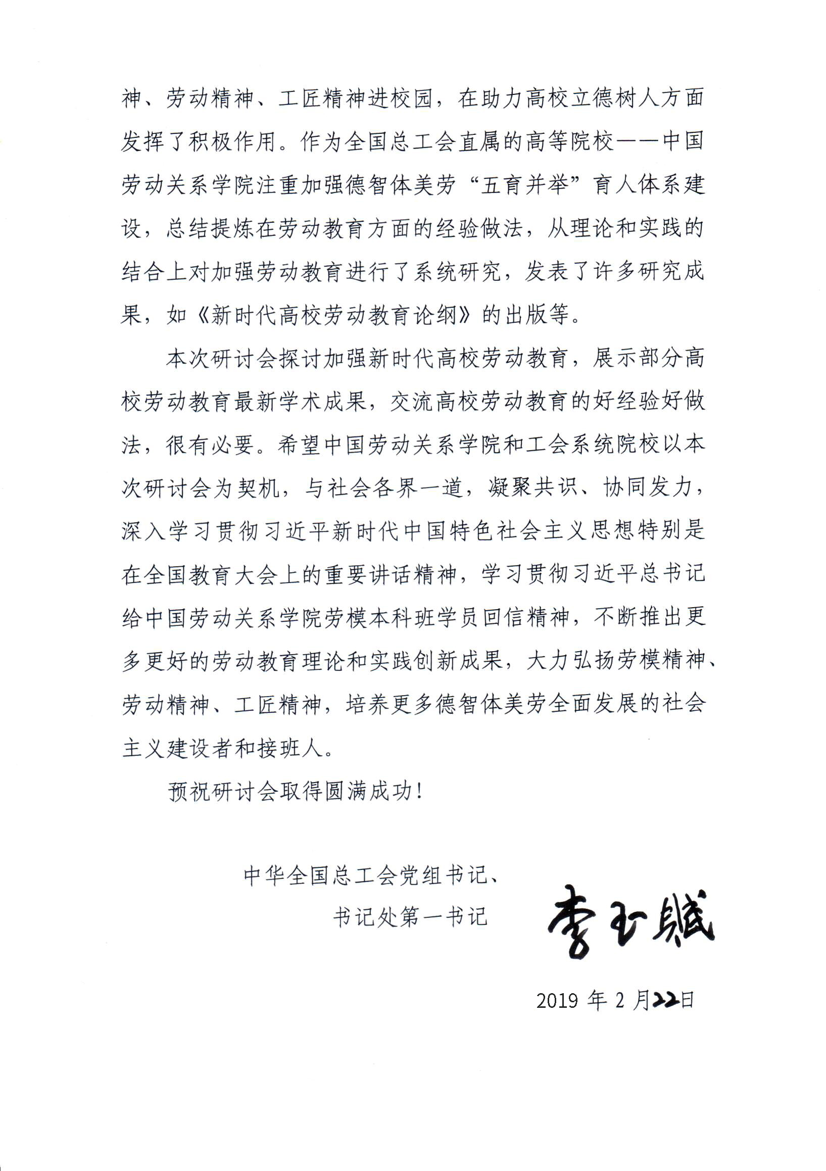 中华全国总工会党组书记、副主席、书记处第一书记李玉赋向ac米兰《新时代高校劳动教育论纲》发布暨高校加强劳动教育研讨会发来贺信