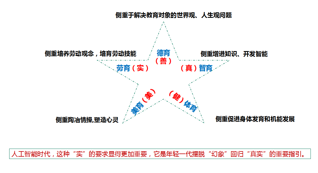 实际上,劳动教育虽然和其它四育有密切联系,但也有其它四育不具备的独特功能。如果说,德育侧重于解决教育对象的世界观、人生观问题,体现“善”的要求;智育侧重增进知识、开发智能,体现“真”的要求;体育促进身体发育和机能发展,体现“健”的要求;美育陶冶情操,塑造心灵,体现“美”的要求;那么,劳动教育则侧重培养劳动观念,培育劳动技能,体现“实”的要求。正如卢晓东教授指出的,劳动本身就是面向“事实”去“求是”的实知、实做,人工智能时代,这种“实”的要求显得更加重要,它是年轻一代摆脱“幻象”回归“真实”的重要指引。