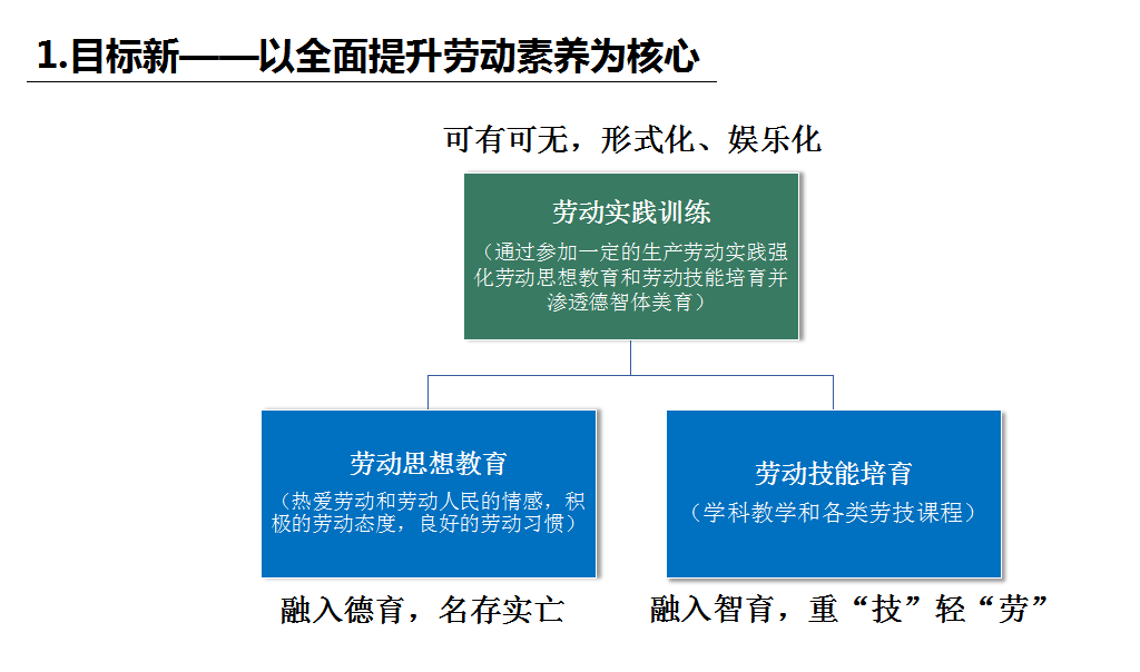 劳动教育以往是作为促进人全面发展的途径而存在,没有自身专门的目标,但有三大任务——劳动思想教育、劳动技能培育、劳动实践训练。