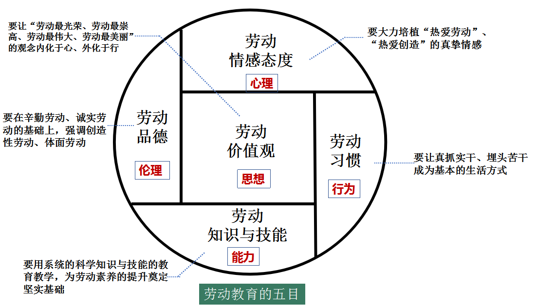 课题组认为,新时代劳动教育应该以全面提升学生劳动素养为核心目标,并基于对素养概念的考察,从新时代劳动对劳动者的思想、心理、伦理、行为、能力等五个方面提出的新要求入手,系统设计了由劳动价值观、劳动情感态度、劳动品德、劳动习惯、劳动知识与技能五部分构成的劳动教育目标体系,其中,劳动价值观是劳动素养的最深层、最核心的要素。