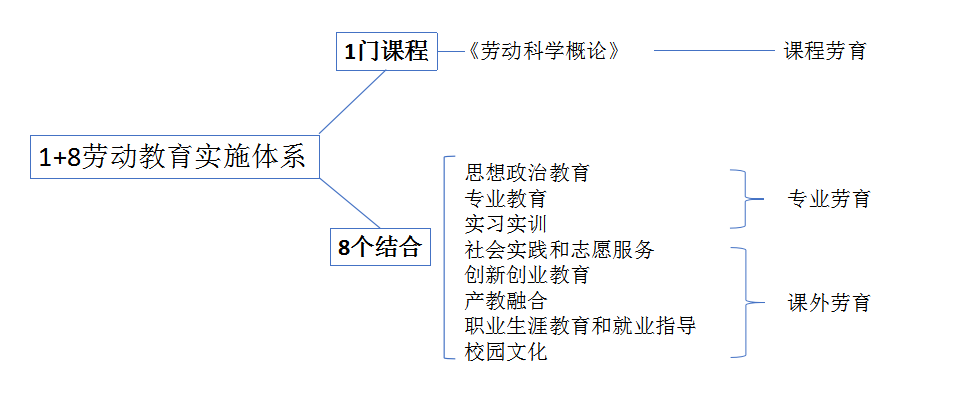 其中,劳动教育与思想政治教育、专业教育、实习实训的结合共同构成了“专业劳育”,与其它五个方面的结合可理解为“课外劳育”。劳动教育本身所具有的“实知”、“实作”的特点,要求我们必须重视“课外劳育”。“1+8劳动教育实施体系”代表了“课程劳育”“专业劳育”“课外劳育”,三位一体、整体推进的新时代高校劳动教育实施格局。