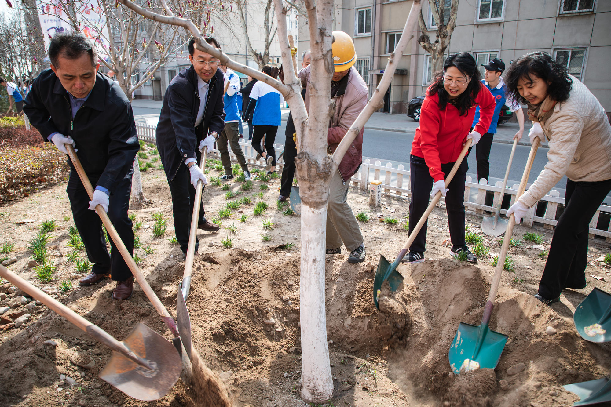 植树现场,在工作人员的指导下,大家挥舞铁锹翻新土、扶植新苗列成行,热火朝天,分工明确,相互协作,道道工序规范认真,劳动场面繁忙有序。
