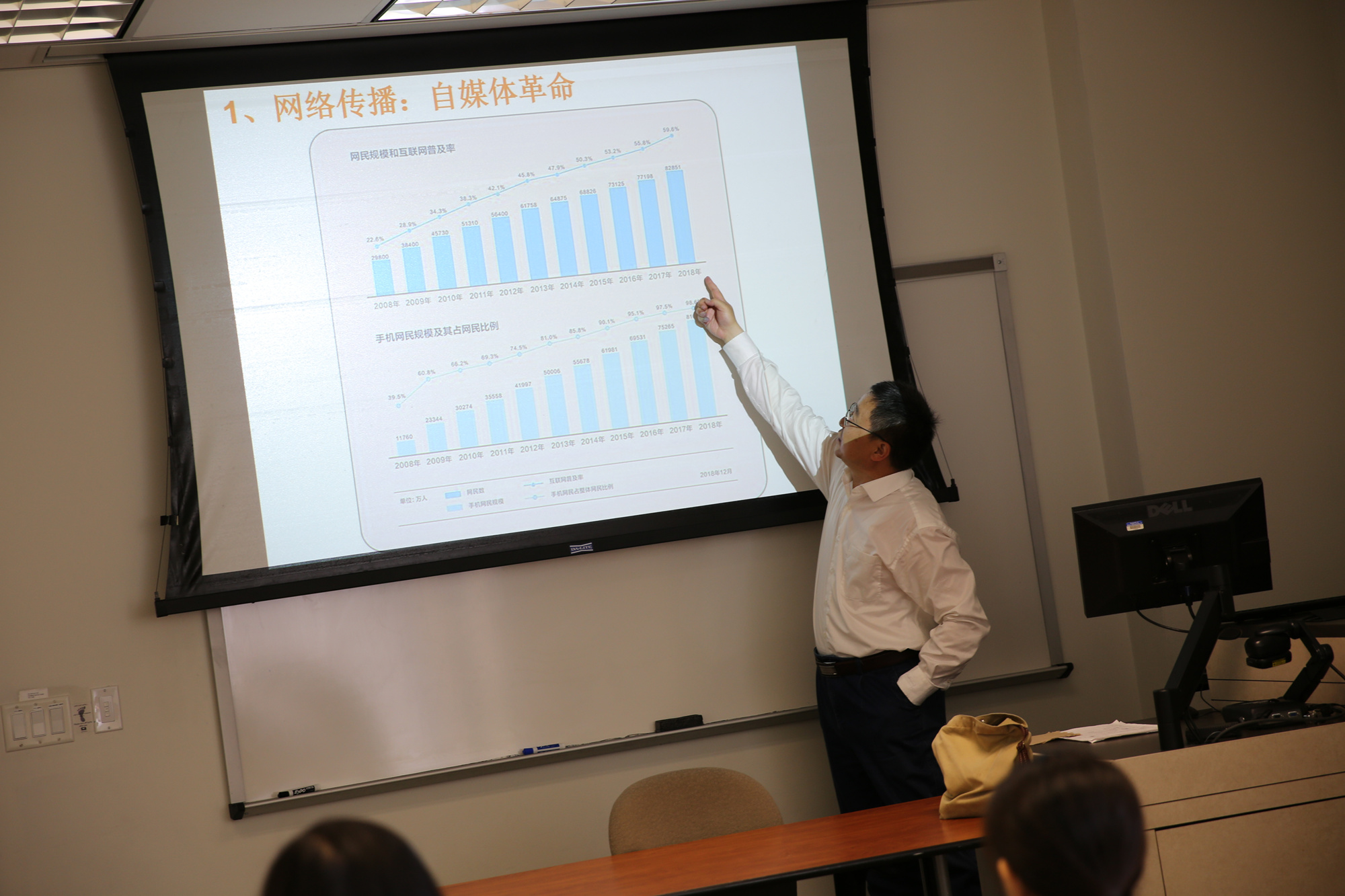 4月18日下午,应美国莱斯大学人文学院及亚洲研究中心钱南秀教授邀请,ac米兰文化传播学院李双教授在莱斯大学人文楼底楼教室,给该院东亚系高年级本科生、研究生以《当代中国微视听语言(Audio-visual language)的网络传播与舆论(public opinion)》为题做专题讲座。钱南秀教授进行同声翻译。