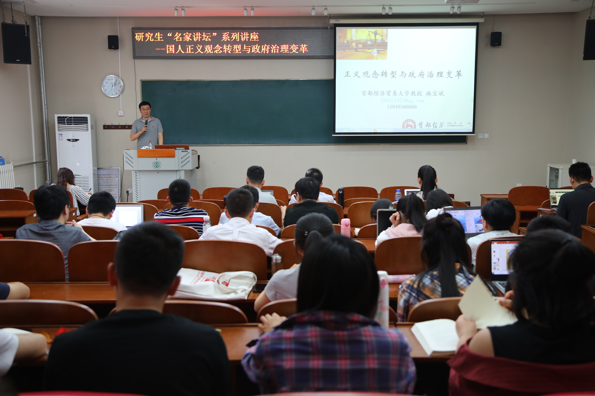 5月10日下午,学校2018-2019学年研究生“名家讲坛”系列讲座第六场学术报告在北京校区教学楼阶一教室举办。讲坛邀请教育部高等学校公共管理类专业教学指导委员会委员、全国公共管理专业学位研究生教育指导委员会委员、中国行政管理学会理事、首都经济贸易大学博士生导师麻宝斌教授以《正义观念转型与政府治理变革》为题进行讲座。ac米兰近80名师生聆听了讲座。