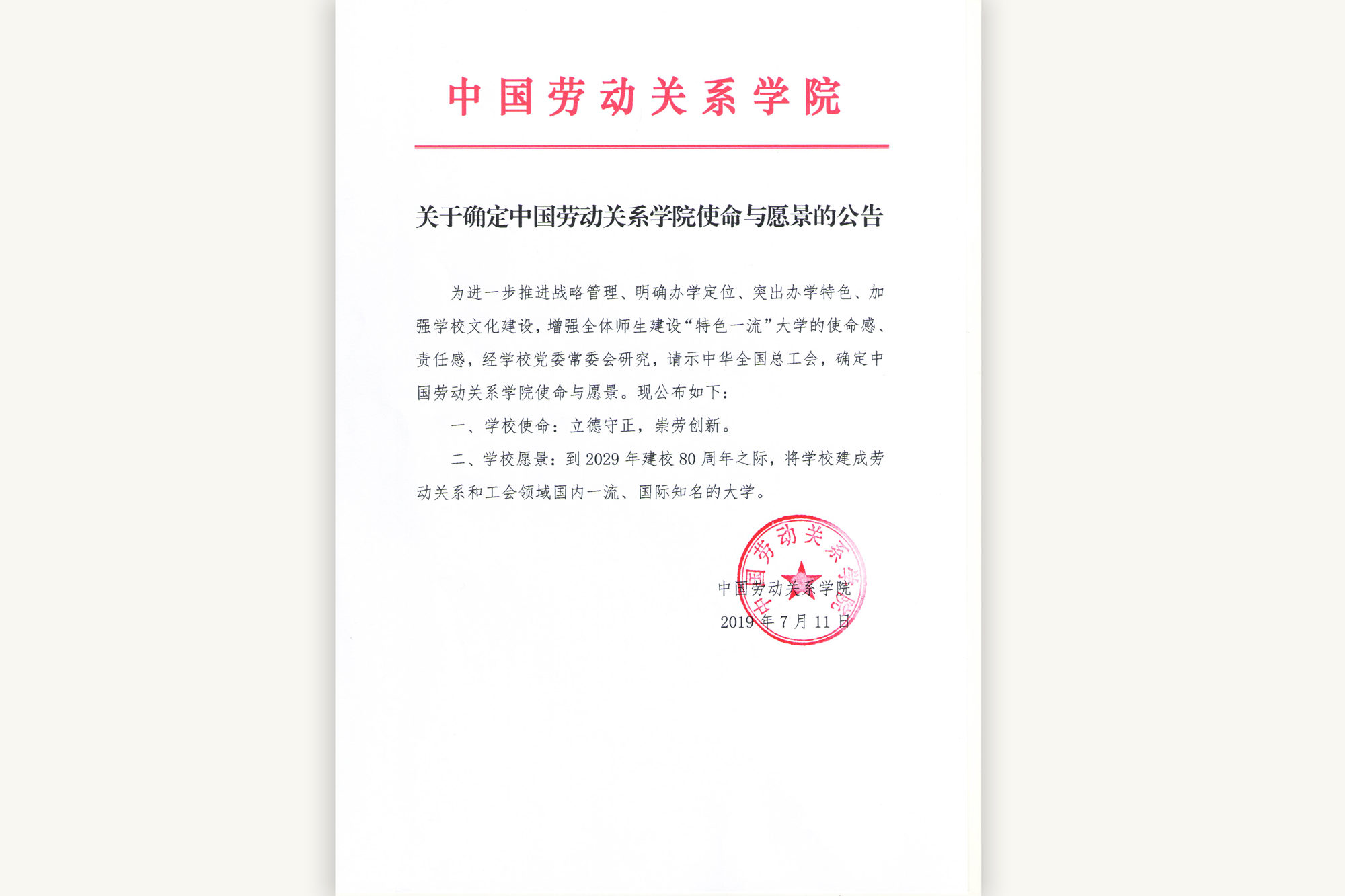 7月5日,学校2019年第十九次党委常委会讨论通过了学校的使命与愿景。使命表述为:“立德守正、崇劳创新”。愿景表述为:“到2029年建校80周年之际,将学校建成劳动关系和工会领域国内一流、国际知名的大学”。