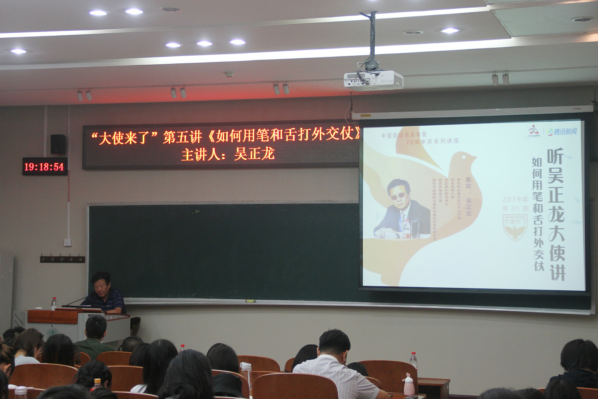 “大使来了”系列公开讲座是学校70周年校庆“教学与院系部活动”的组成部分,此前已邀请孙玉玺、刁鸣生等四位大使作为主讲嘉宾。本学期,活动还将继续邀请多位退休资深外交官,通过讲述自己亲身的外交经历与历史经验,展示各国在内政外交中的大谋划,分享外交官们从丰富的研学实践中悟出的智慧与心得。