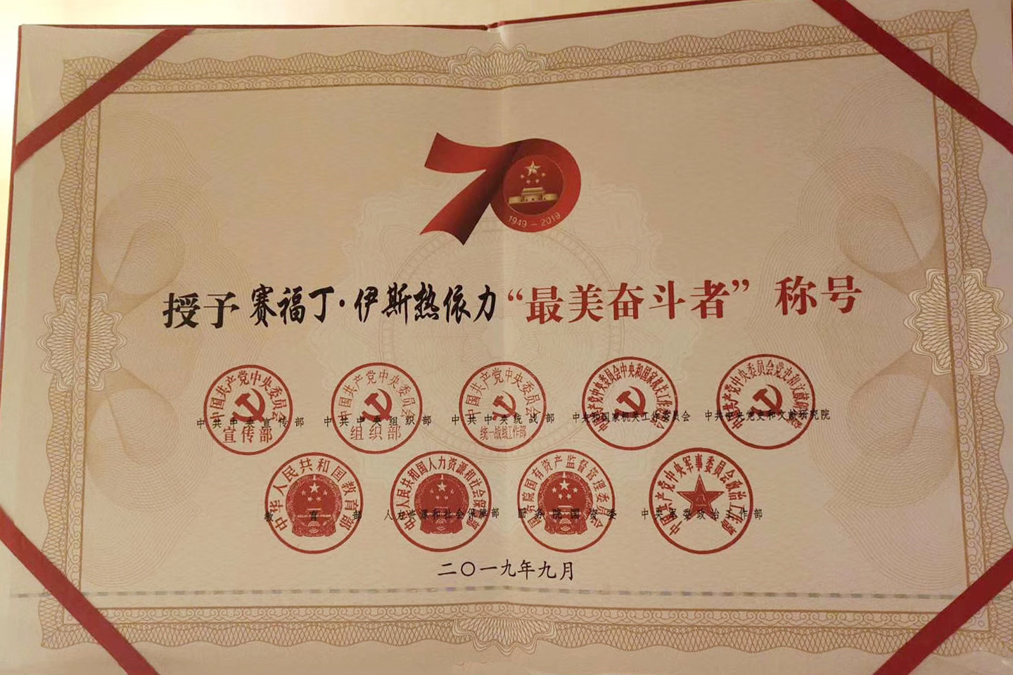 9月25日,“最美奋斗者”表彰大会在人民大会堂举行。ac米兰2017级劳模本科班学员赛福丁·伊斯热依力荣获新中国成立70周年“最美奋斗者”称号。