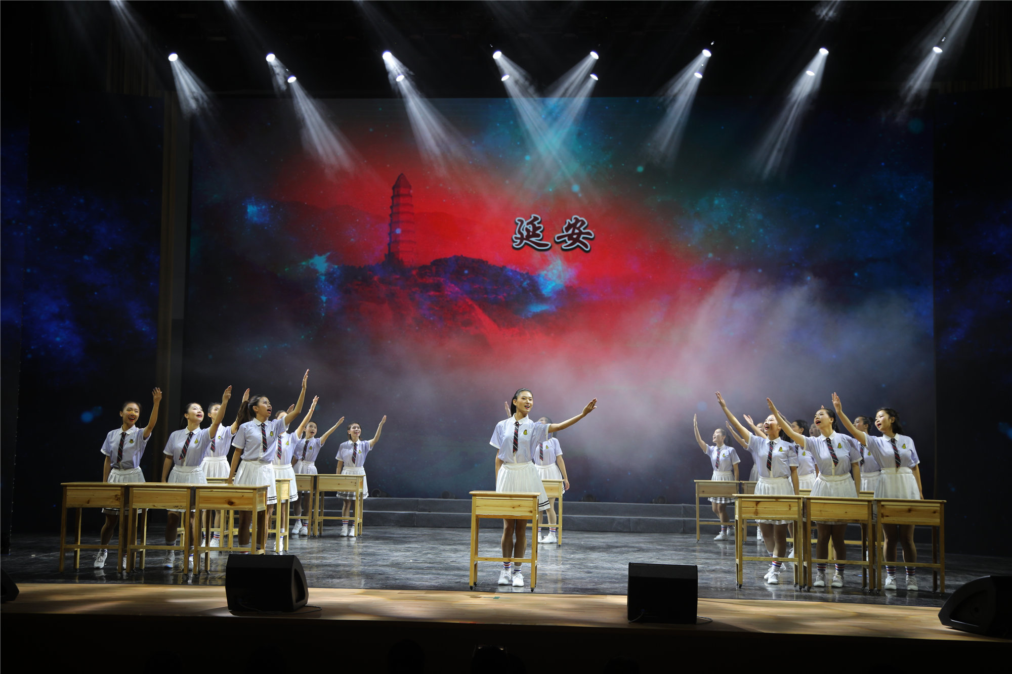 舞蹈剧《从这里出发》中,同学们踏着青春的步伐,推着课桌小跑上台,陕北、新疆、福建、黑龙江,来自祖国各地的有志青年,肩负重任、团结一心,从延安到天津、从天津到北京,跟随学校从抗战烽火中一路走来。同学们奋力奔跑、相互鼓励,不忘最初的梦想,展现了从新时代再次出发的青春斗志。