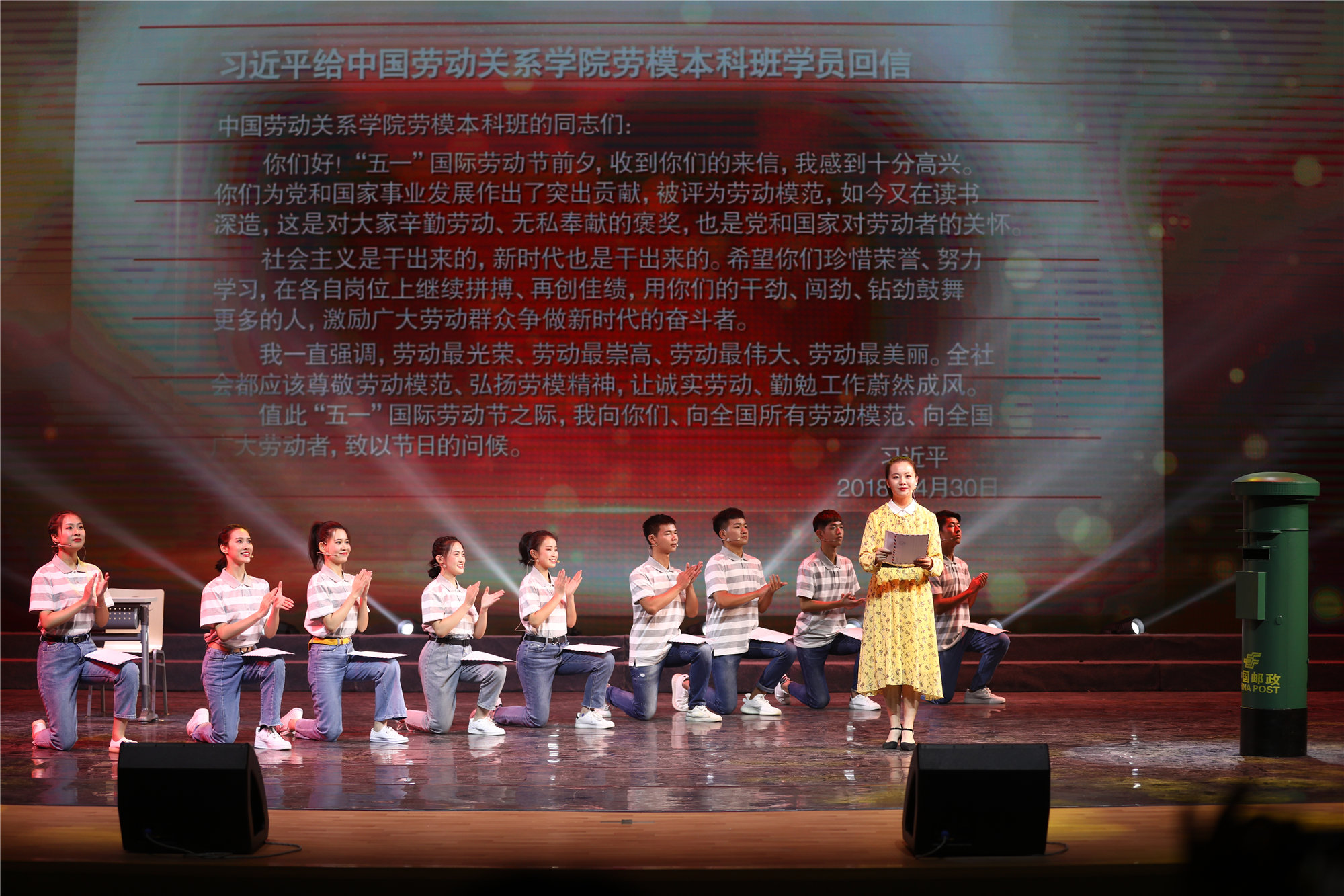 情景剧朗诵《一封来信》一一拆开了中劳人尘封的记忆,他们有各级校友对母校真挚情感的流露表达,有大一新生向父亲汇报学校新生活的喜悦,也有已到不惑之年的毕业生向母校汇报近来的工作情况……其中,一封2018年劳动节前夕习近平总书记给ac米兰劳模本科班学员的300字回信将节目推向高潮,纸短情长的回信饱含着总书记对全校师生、全体劳动者的深切关怀。荧幕上还展示了一张张师生对母校生日祝福的卡片,暖人心扉。