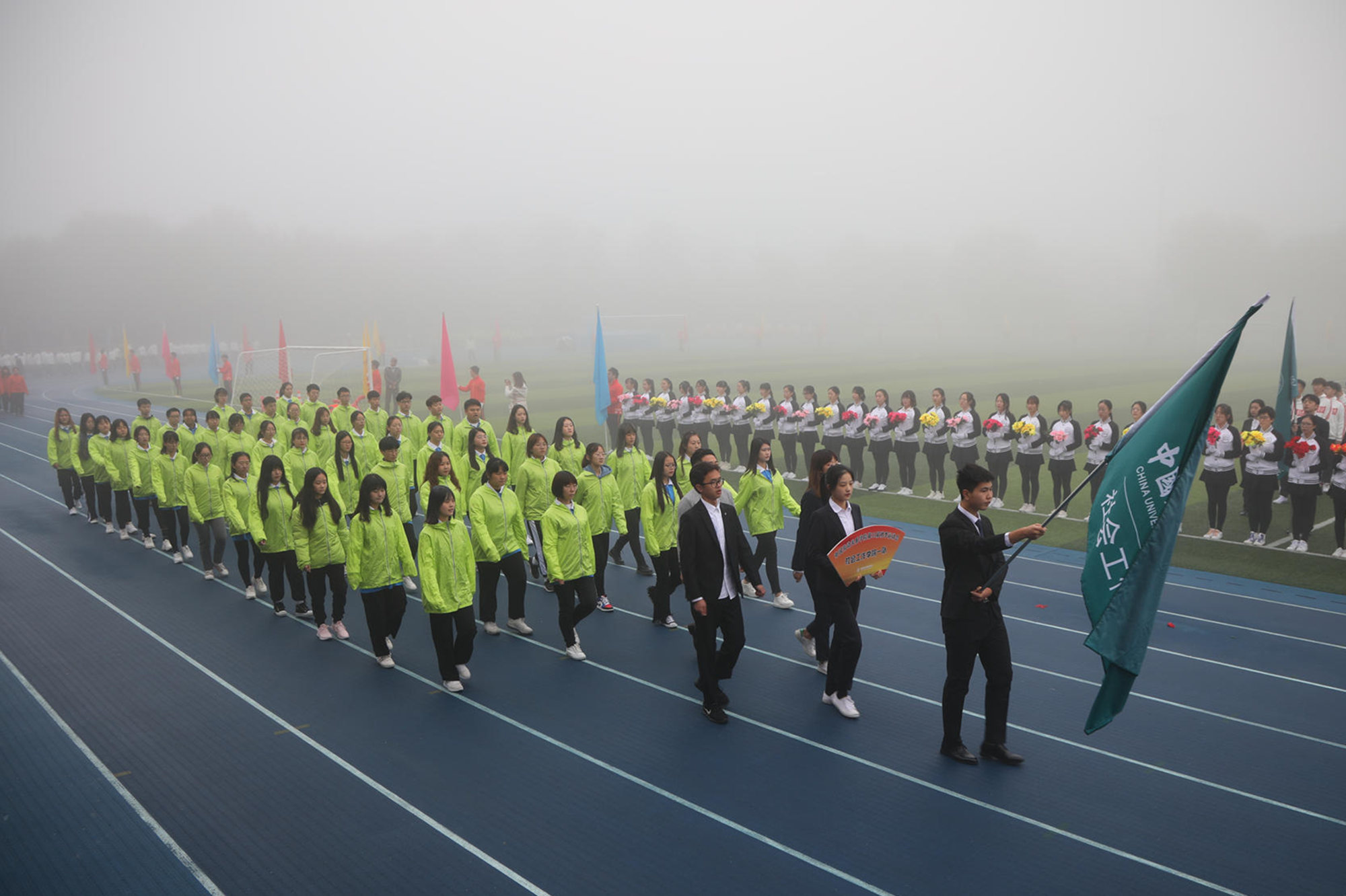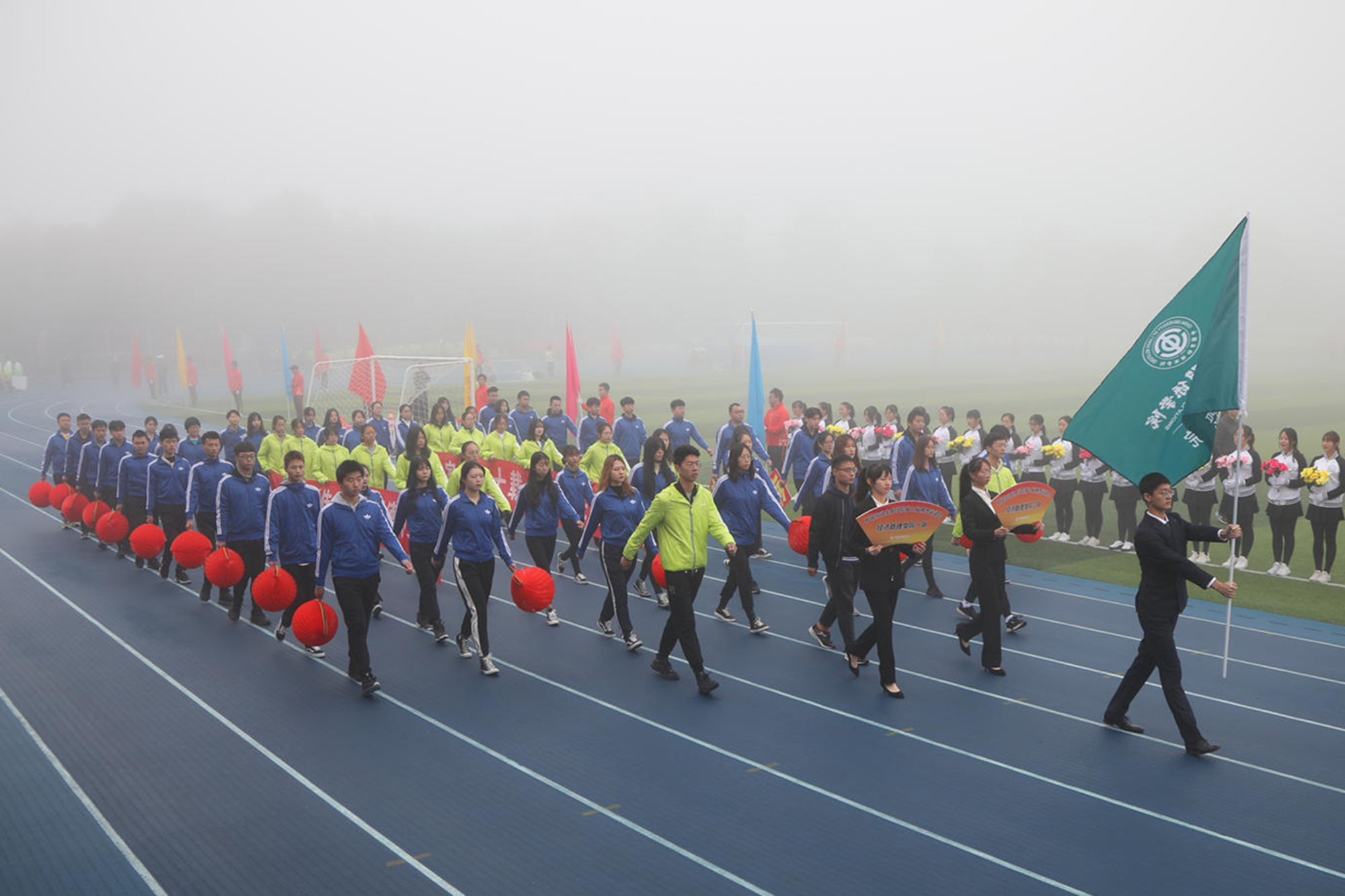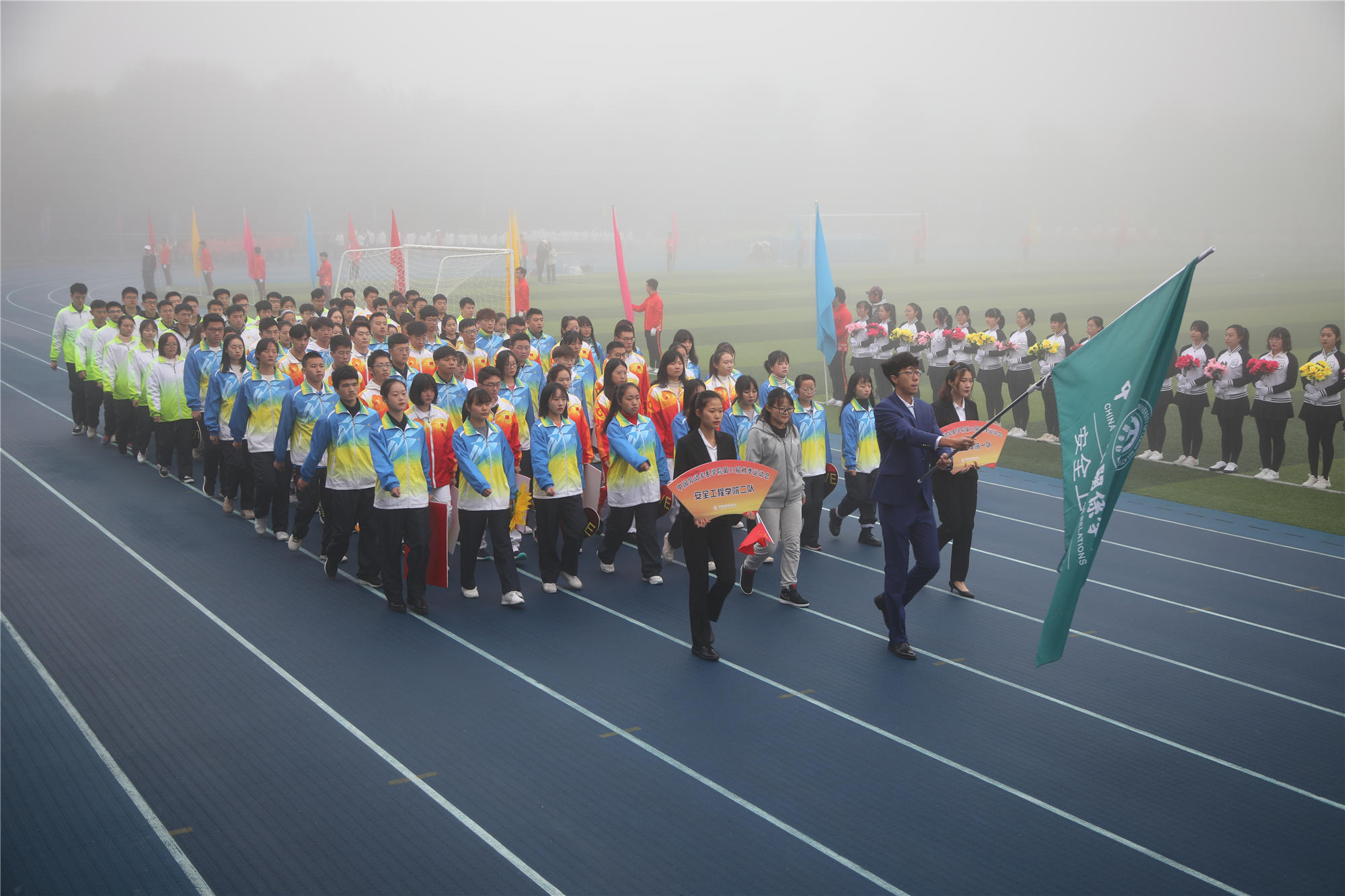 10月18日上午,涿州校区雾色空濛、秋意渐浓,略带寒冷的天气并没有影响到运动健儿和观众们的热情,学校第三十三届秋季运动会暨第十四届校园体育节在体育场成功举行。学校领导李华东、刘玉方、刘丽红出席开幕式。各学院和相关职能部门负责人、涿州校区部分师生参加开幕式。刘玉方副校长宣布运动会开幕。