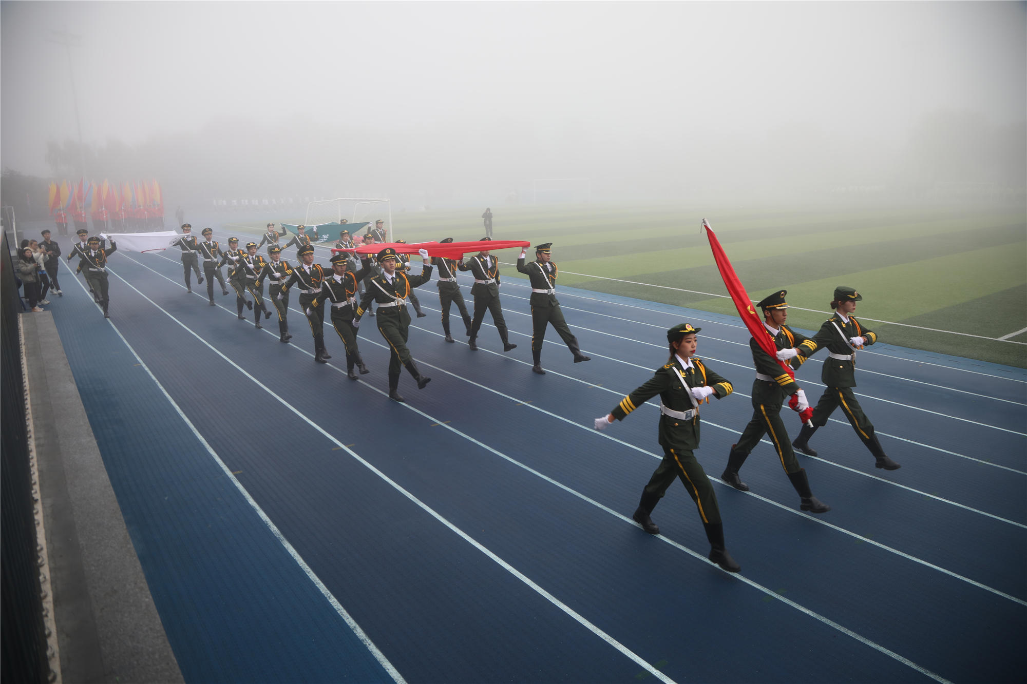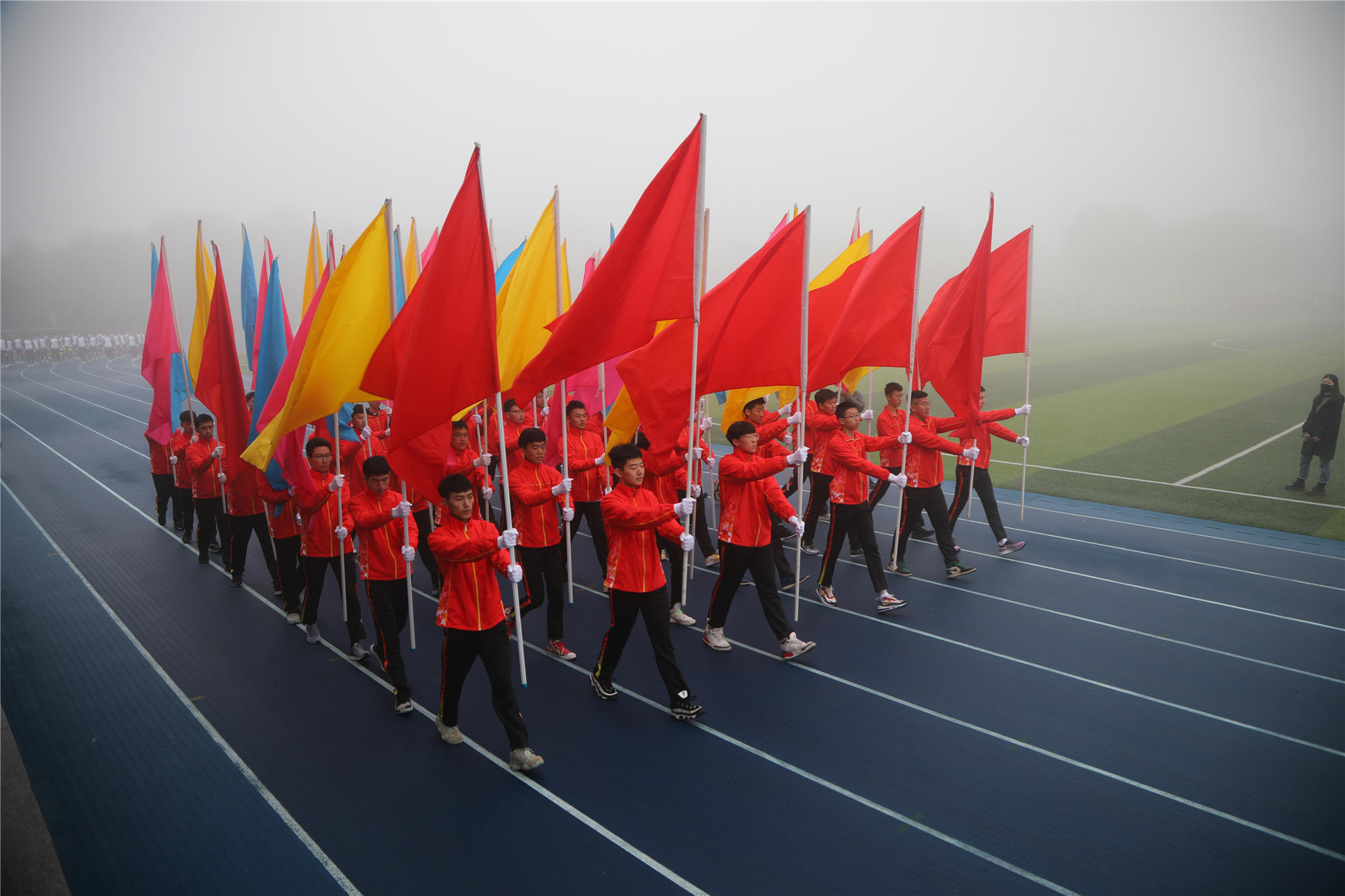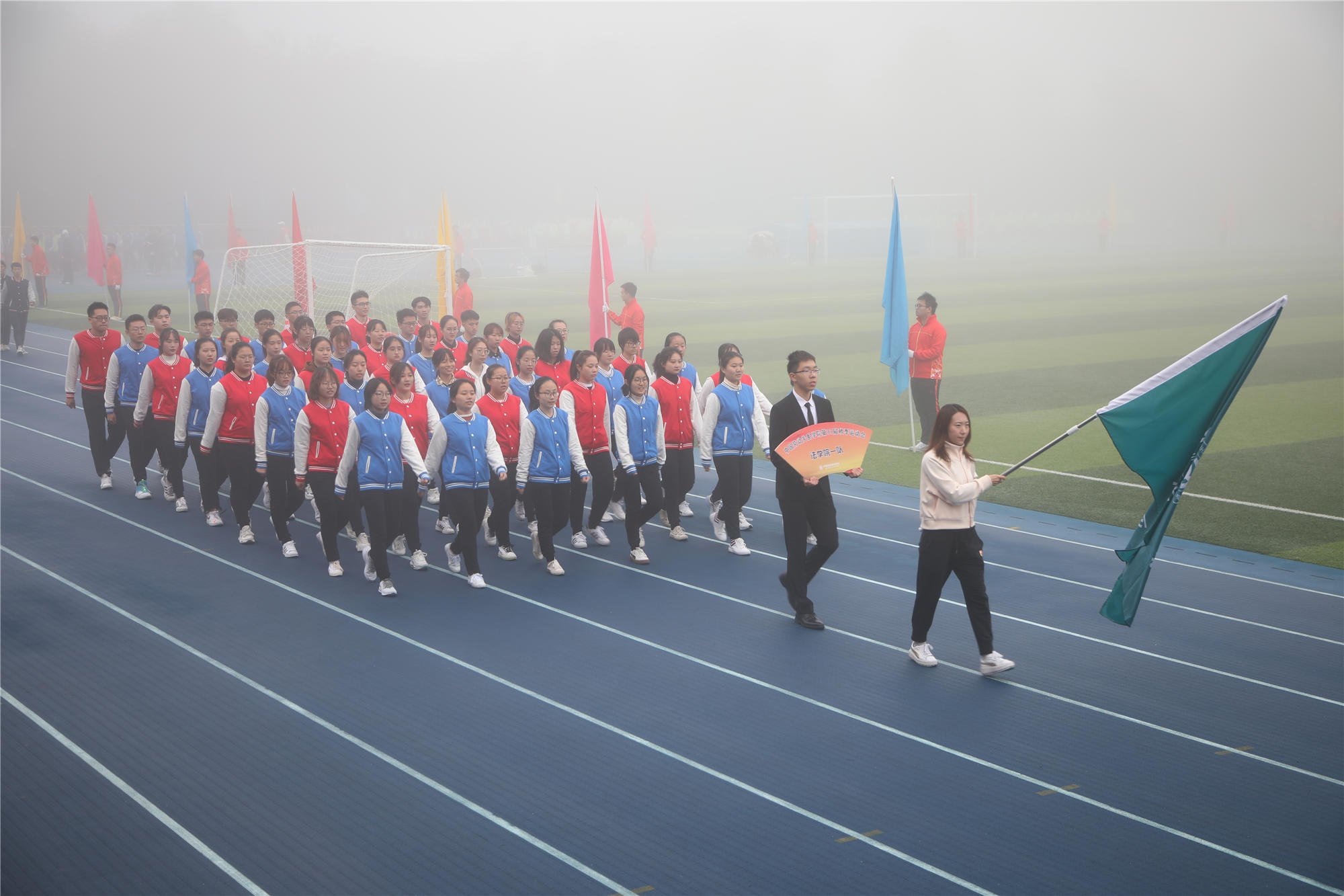 10月18日上午,涿州校区雾色空濛、秋意渐浓,略带寒冷的天气并没有影响到运动健儿和观众们的热情,学校第三十三届秋季运动会暨第十四届校园体育节在体育场成功举行。学校领导李华东、刘玉方、刘丽红出席开幕式。各学院和相关职能部门负责人、涿州校区部分师生参加开幕式。刘玉方副校长宣布运动会开幕。