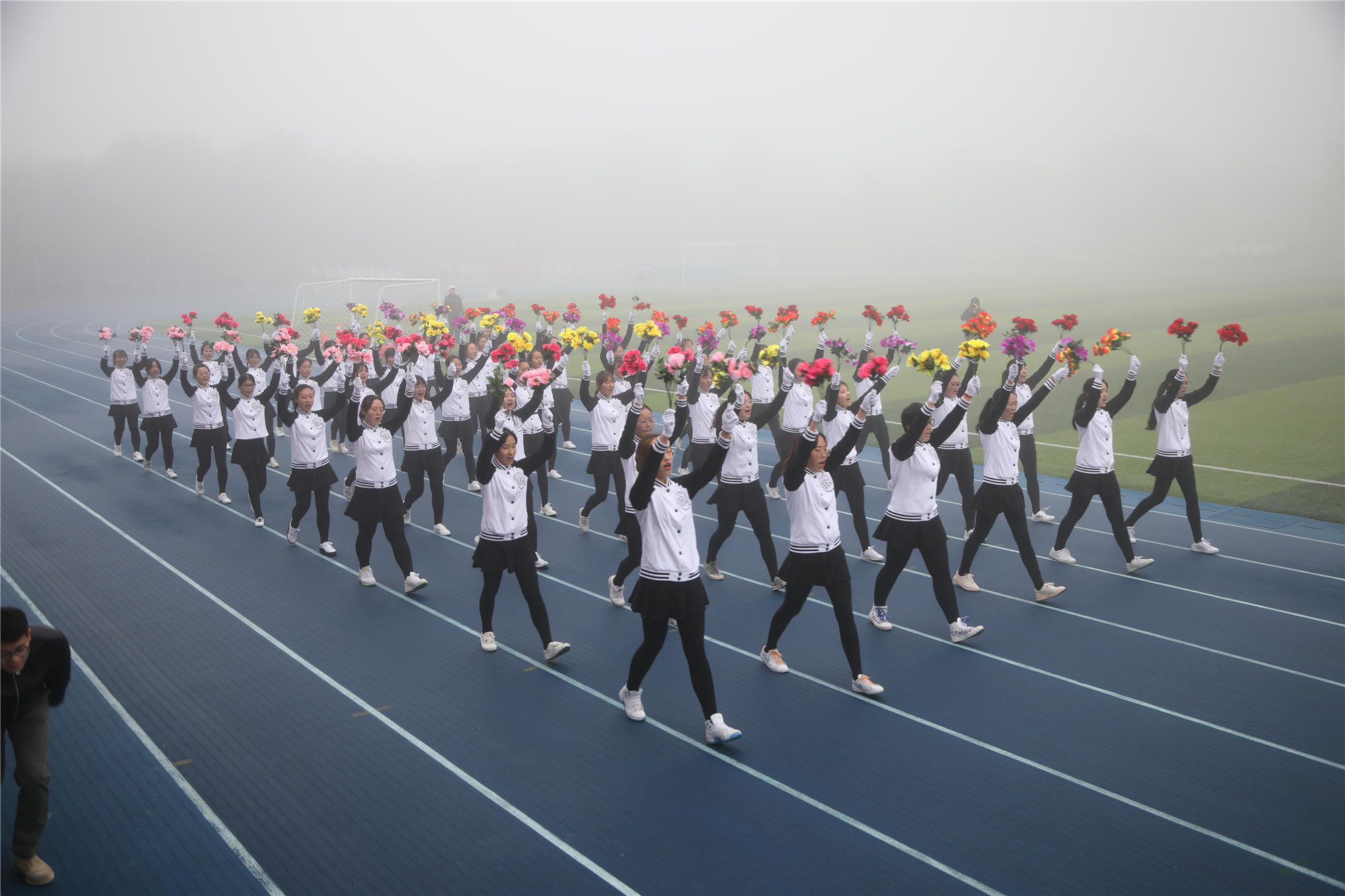 在学校国旗护卫队的引领下,由公共管理学院学生组成的彩旗队、花束队以及其他各学院运动员方队喊着嘹亮的口号,排着整齐的队形,踏着坚定的步伐从主席台前走过。方队既彰显了学子们的青春活力,又体现了学校的蓬勃生机。随后,学生们还带来了韵律操《我们都是追梦人》、武术、体育舞蹈等精彩表演。