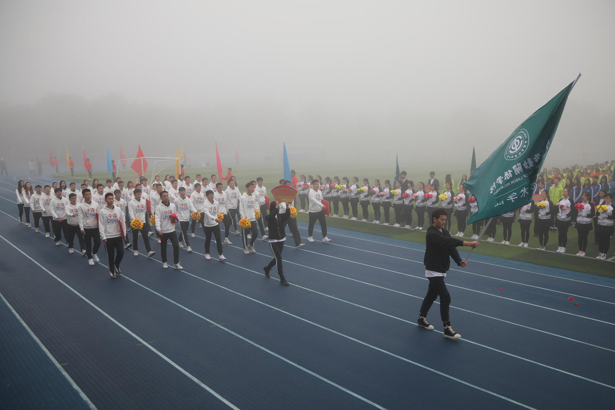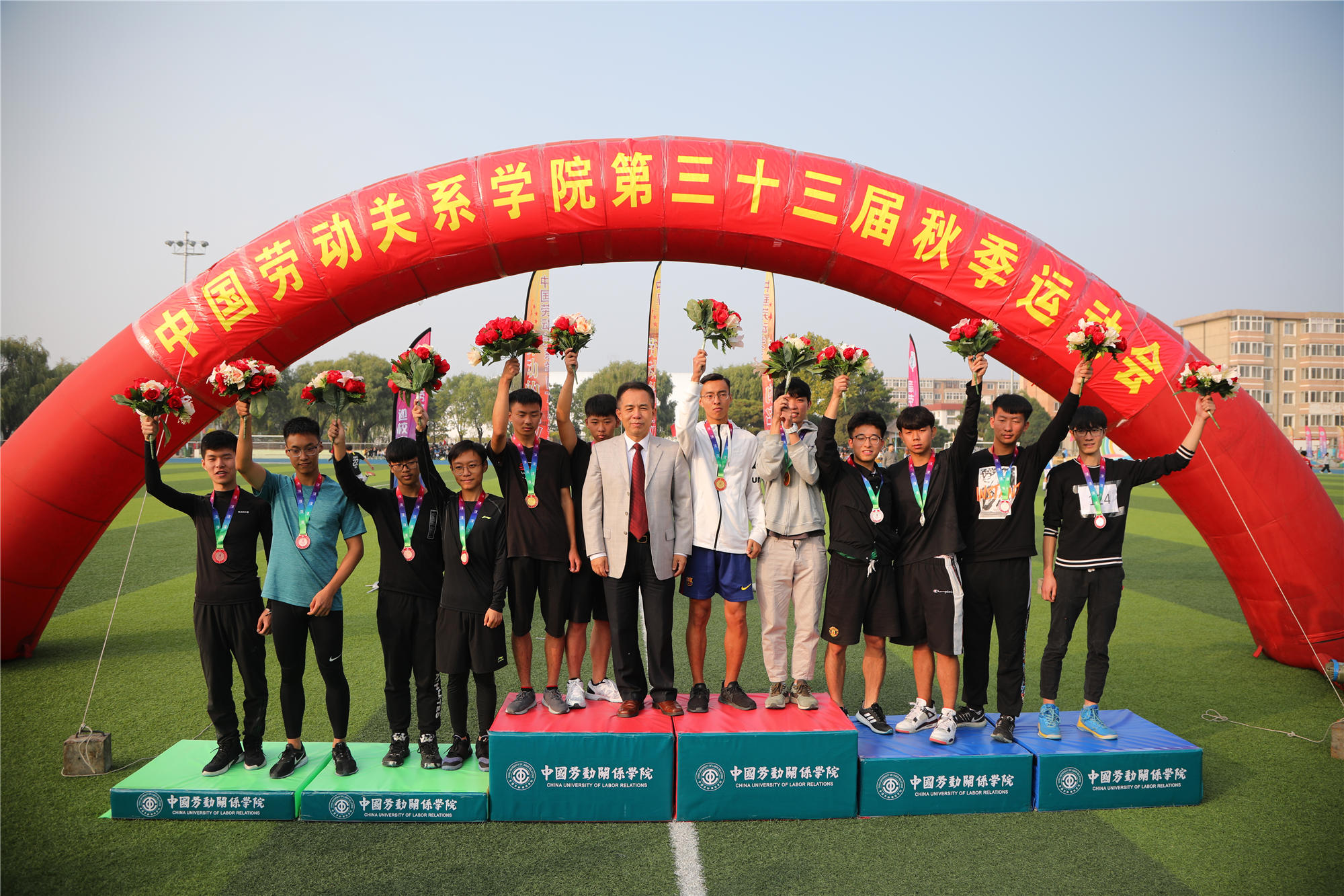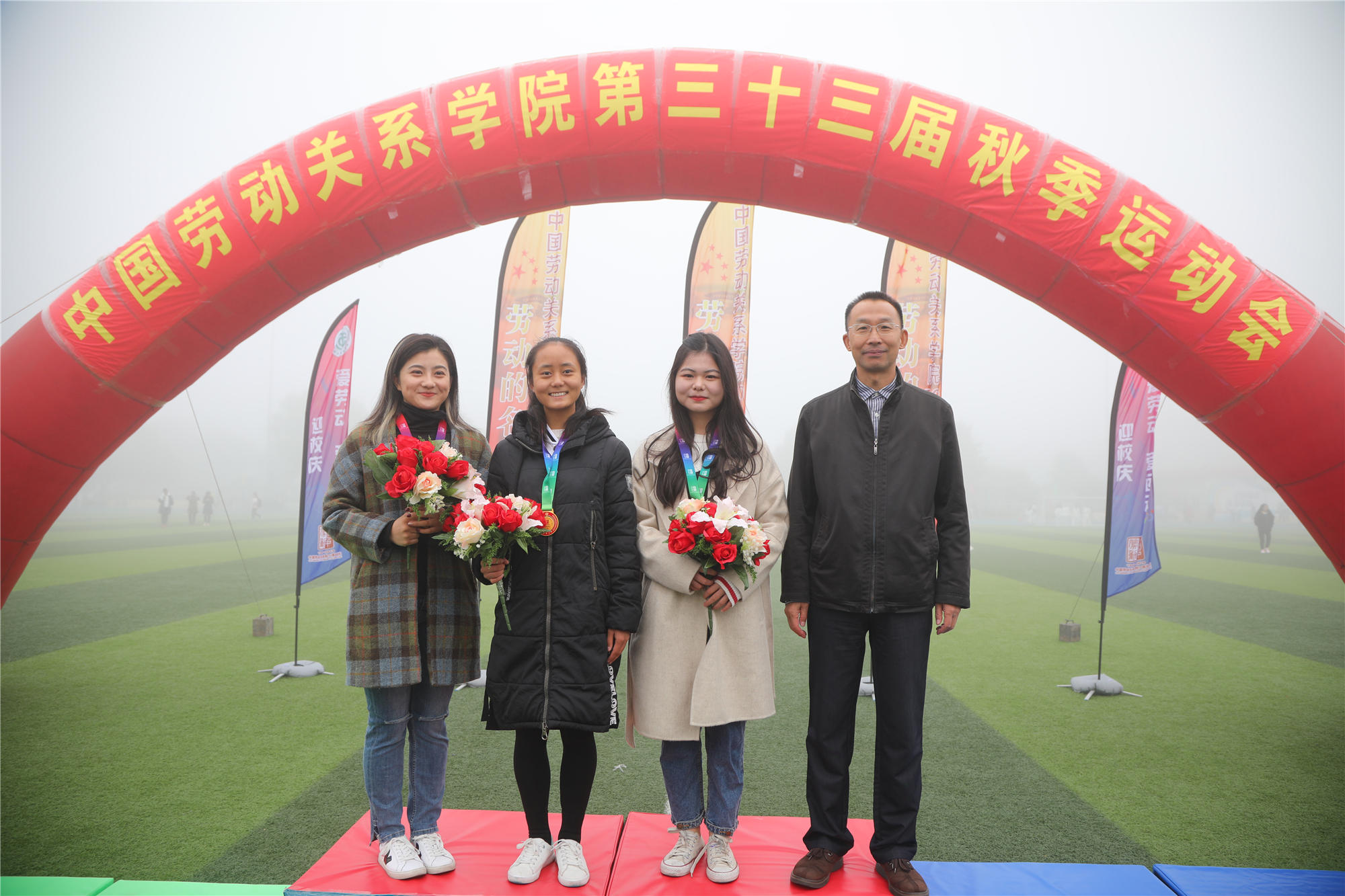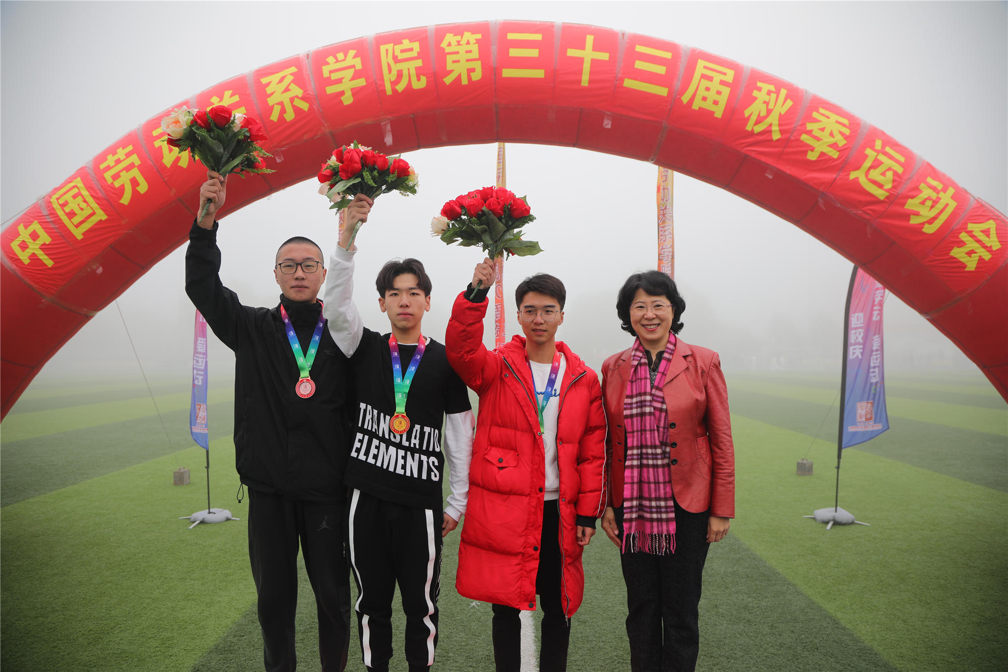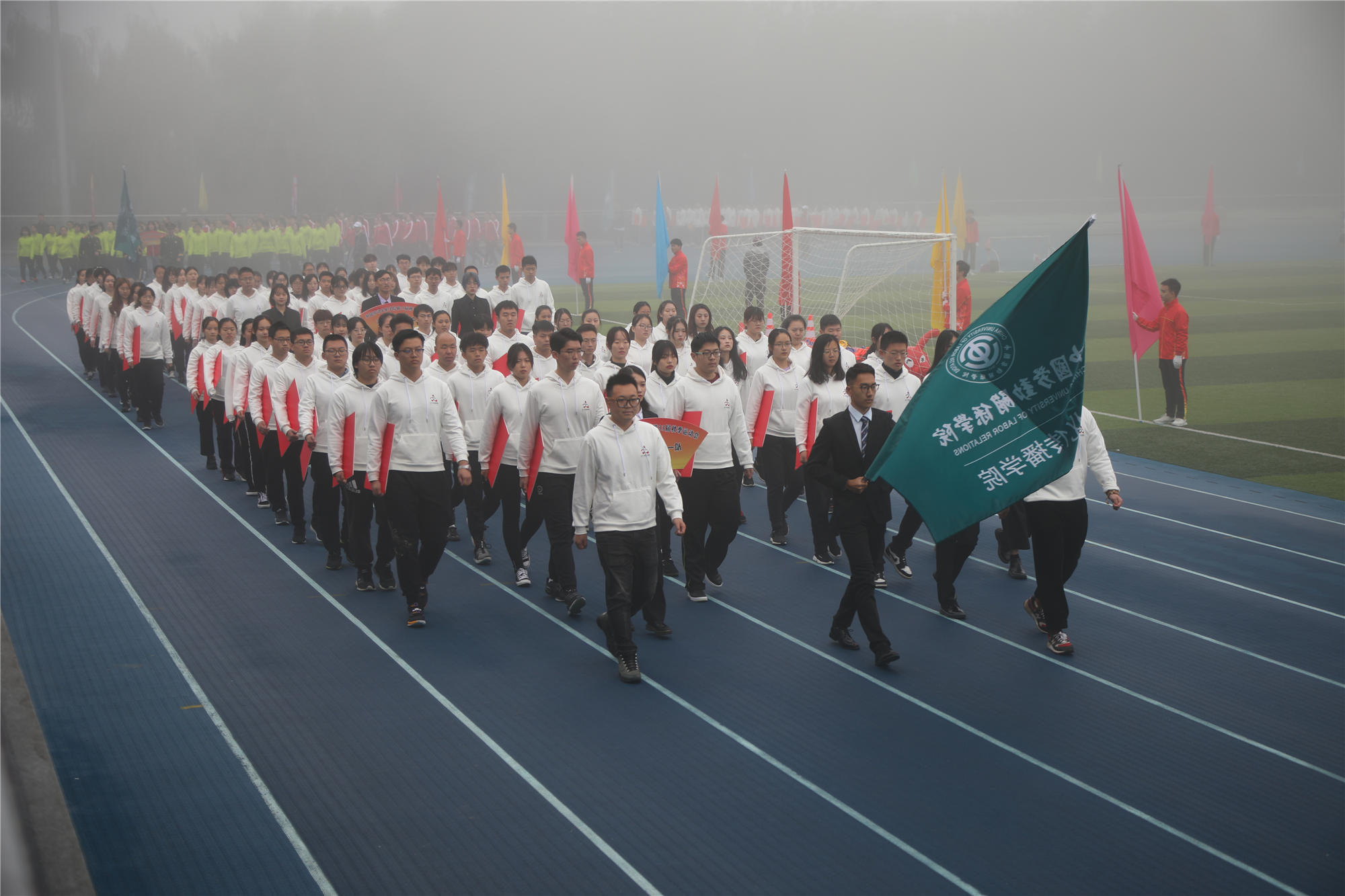 开幕式结束后,运动会比赛正式开始。下午的比赛中,雾气散去,天气转晴,阳光明媚。本次运动会,共有1881人次参加了31个比赛项目。除常规的田径项目外,还进行了男女混合跳长绳、体测团体赛等团体项目,彰显了团结拼搏的体育精神。最终,2018级法学2班荣获男子团体第一名、2019级酒店管理3班荣获女子团体第一名、2019级劳动经济学班荣获团体总分第一名,应用技术学院、公共管理学院、文化传播学院、安全工程学院、经济管理学院、酒店管理学院、法学院、劳动关系与人力资源学院、社会工作学院分获体育道德风尚奖,公共管理学院、应用技术学院荣获最佳组织奖。
