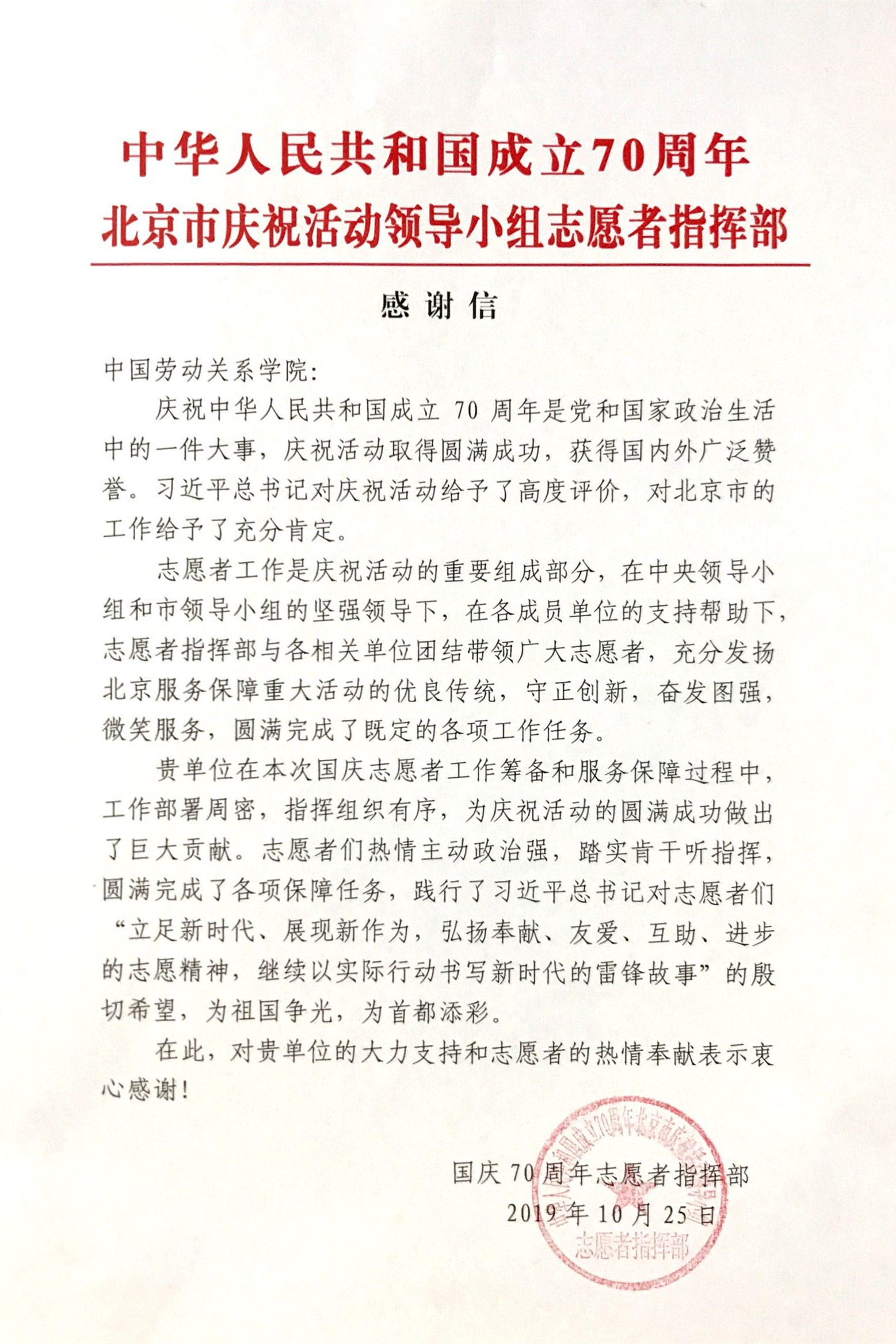近日,国庆70周年志愿者指挥部发来感谢信,对ac米兰志愿服务工作给予高度评价,对ac米兰参与国庆70周年庆祝活动并作出突出贡献的146名青年志愿者表示感谢。