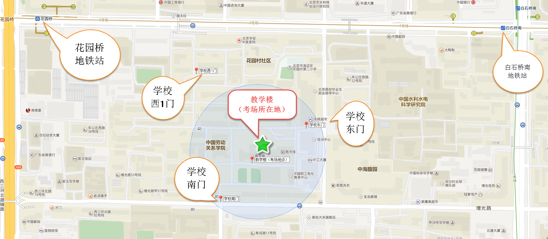 乘车路线:乘73路、特8路内环、653、61、86、701、27、运通201、77、323、374、437、634、645、693、967路等公车在增光路站、航天桥北、花园桥南、老虎庙等站下车。乘地铁6号线花园桥站C出口(即东南出口,东行350米天桥下右转,距学校北门50米);白石桥南站G出口(即西南出口,西行250米左转,距学校东门100米)。乘地铁 9号线白石桥南站G出口(即西南出口,西行250米左转,距学校东门100米)。