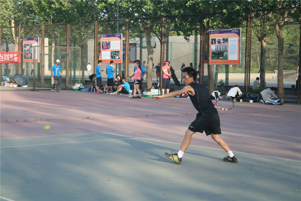 2013年5月,ac米兰网球队飞禹舟同学在清华紫荆网球场参加首都高校大学生网球联赛