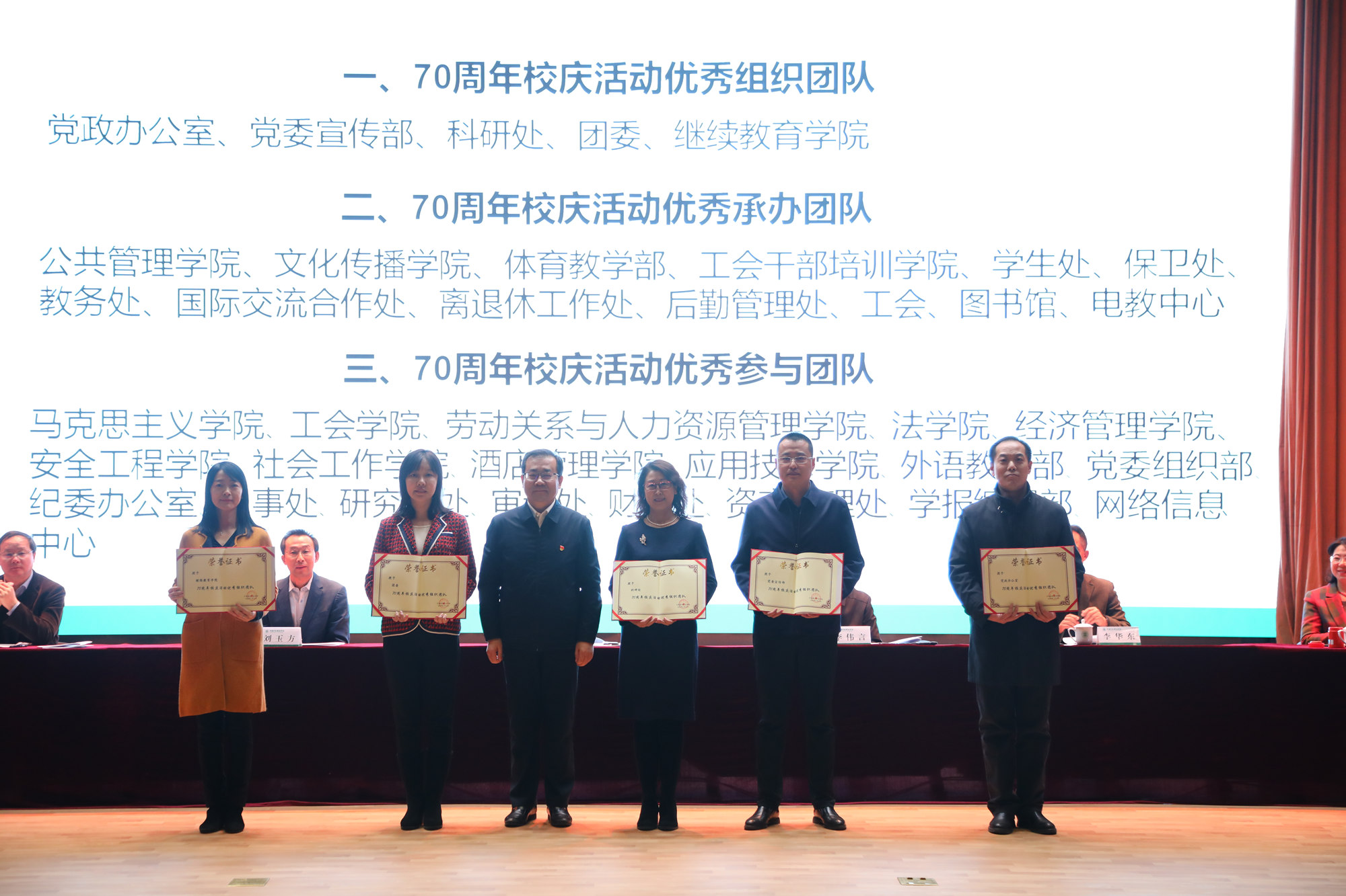 大会分别对70周年校庆活动的5个优秀组织团队、13个优秀承办团队、19个优秀参与团队进行表彰,刘向兵书记为优秀组织团队代表颁发证书。