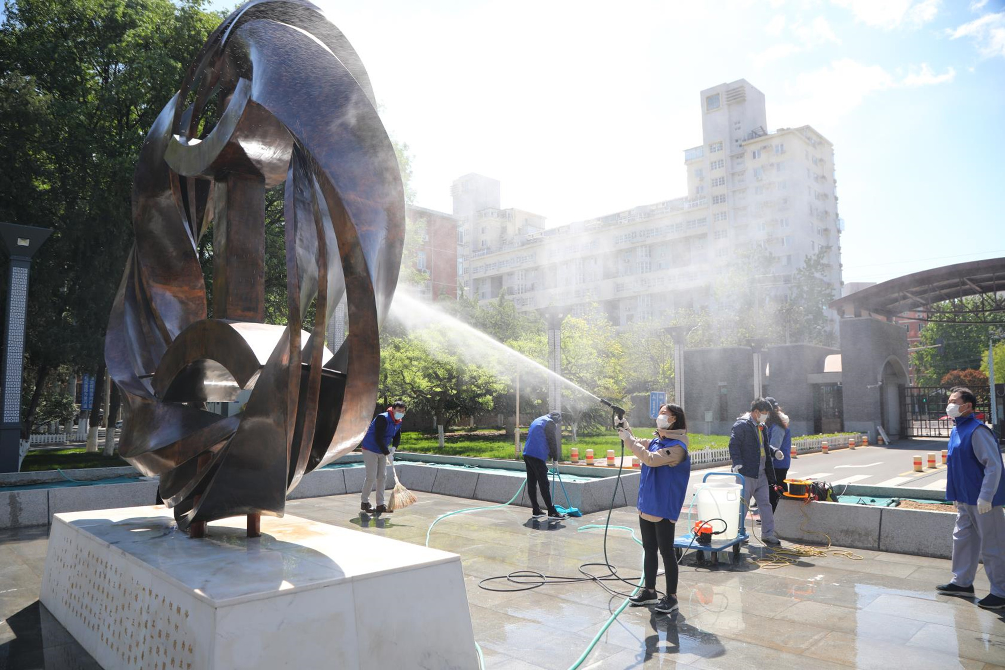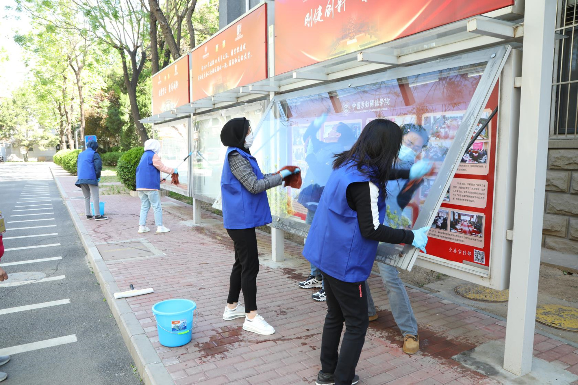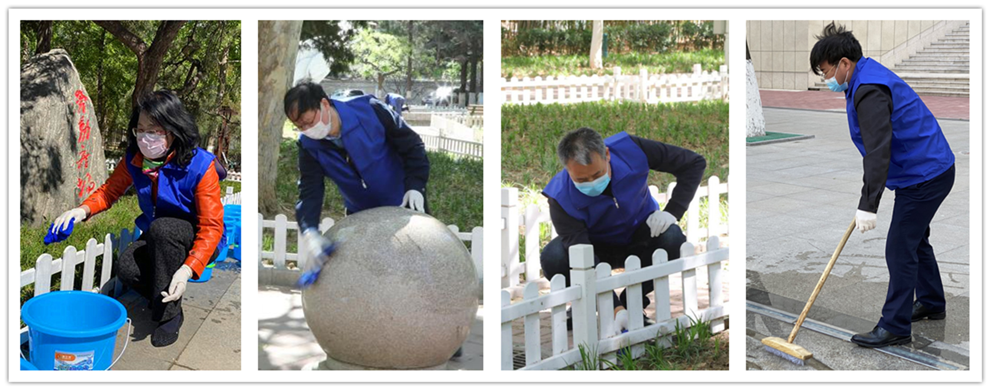 此次活动分设6个不同区域的卫生清洁及环境改善任务,参与人员做好个人防护后,有序领取劳动工具,按照任务分工,来到各自场地,投入劳动。有的擦拭雕像栅栏、有的清扫地面、有的清洁橱窗、有的为灌木挂上粘蚊板、有的清运垃圾……校园里一派热火朝天的劳动景象。活动中,大家各司其职、身体力行,发扬不怕脏、不怕累的劳动精神,为创造更加优美整洁的校园环境出一份力,充分体会到劳动的快乐和成就感。