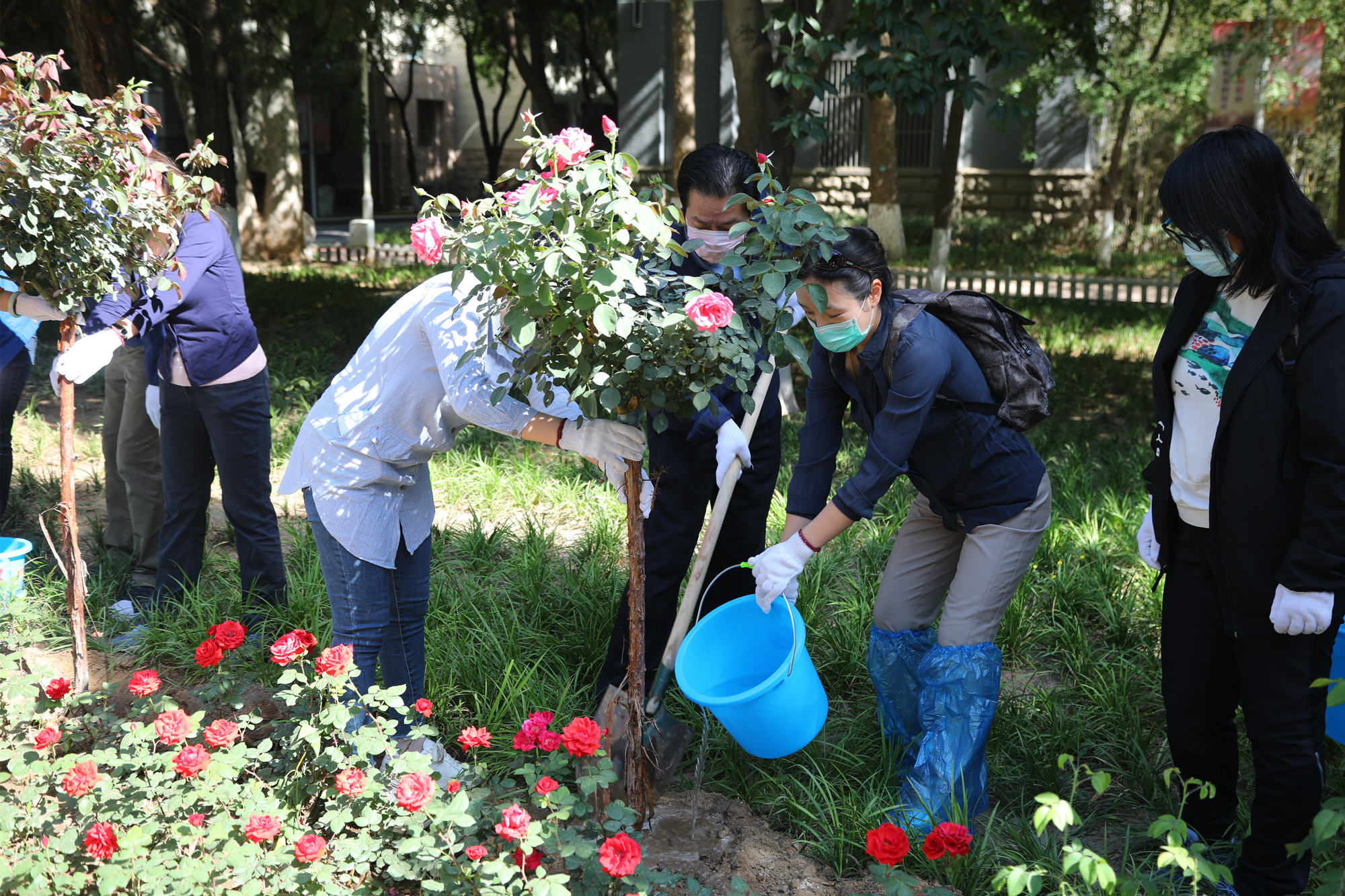 活动中,各位老师挥锹铲土、挖坑栽种、培实掩埋、浇水灌溉……认真细心地栽花种树,现场一派热火朝天、干劲十足的景象。在大家的共同努力下,一株株月季、一棵棵海棠香飘四溢,为美丽的校园平添了一缕芬芳。