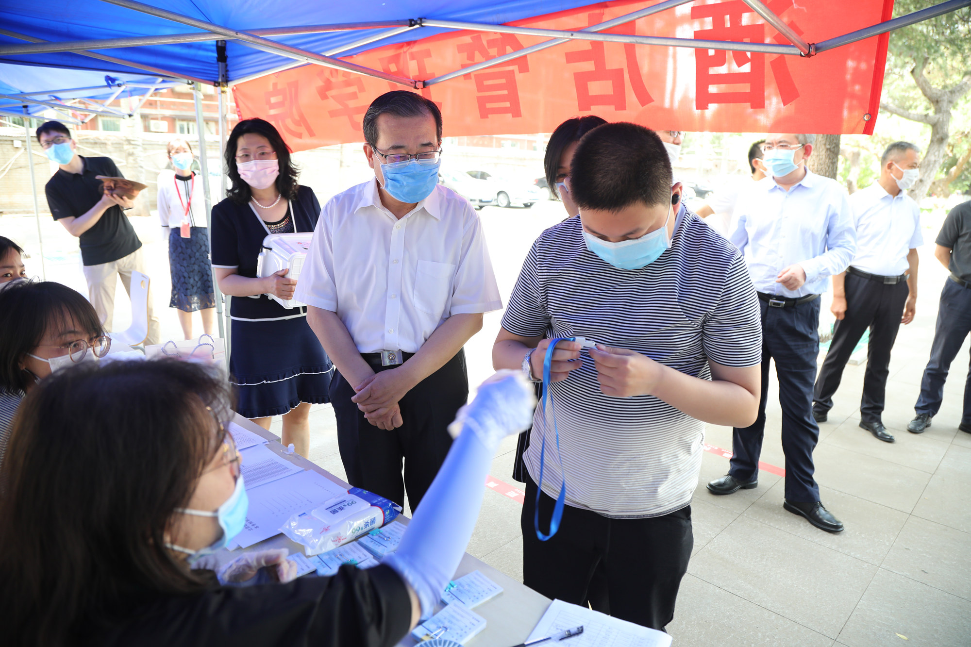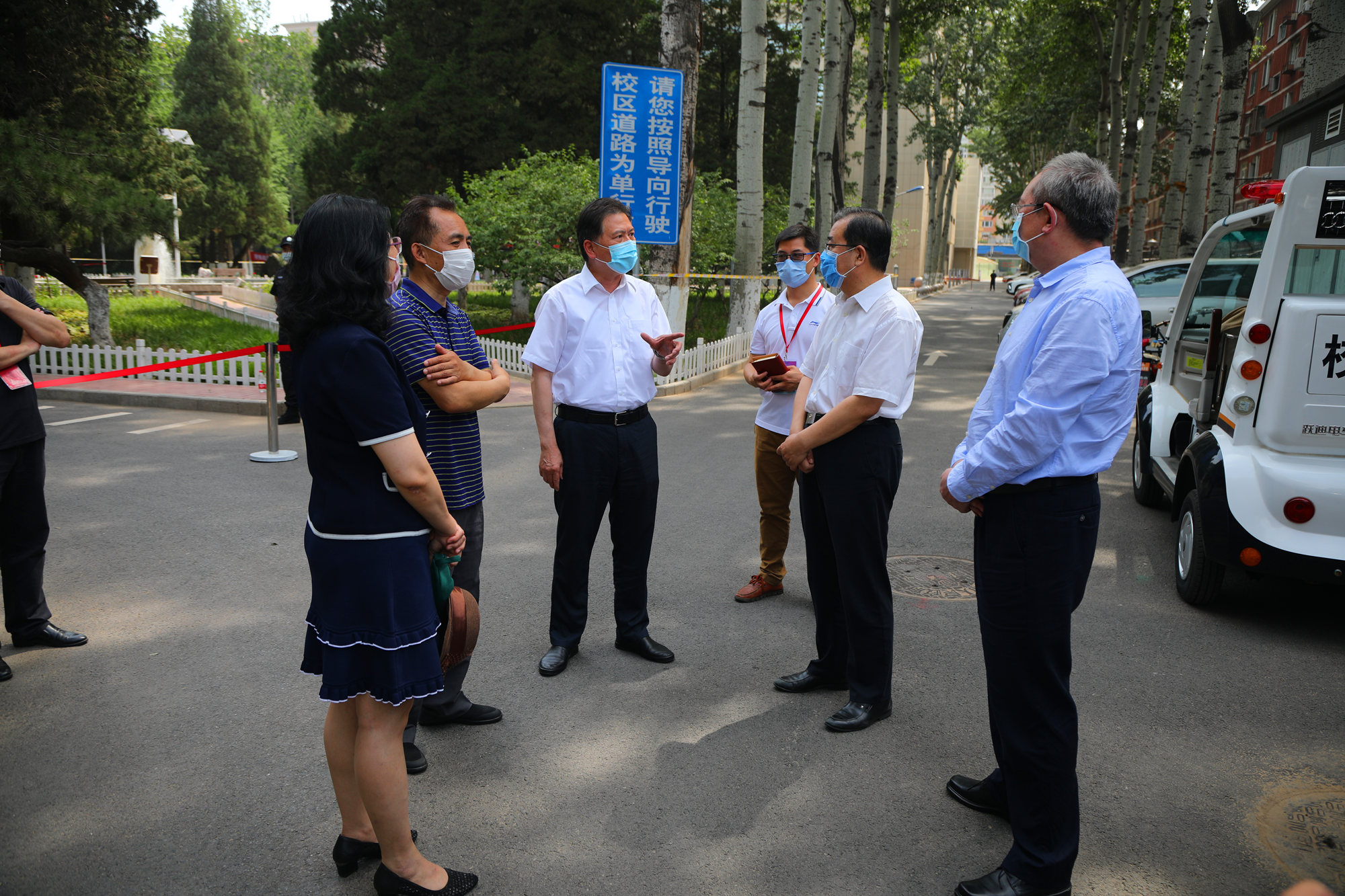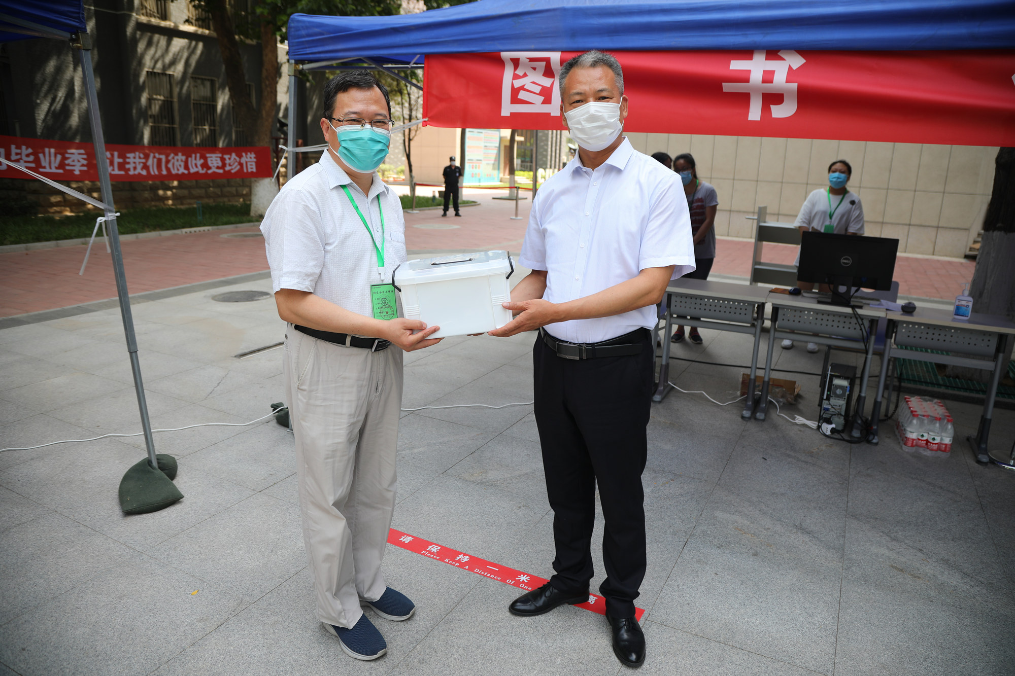 刘向兵书记、傅德印校长一行走访慰问各个工作站点的教职员工,询问了解返校学生的生活物资准备和身体健康情况,叮嘱图书馆、校园网络中心等部门做好服务工作,全力配合返校学生及时办理毕业前的各项手续,并向一线工作人员发放慰问品。他们强调,首批毕业年级学生的返校工作将从上午6点开始,至晚上12点结束,工作量很大,加之高温天气,一线的老师们更要注意防暑降温和劳逸结合,保证返校工作平稳有序进行。