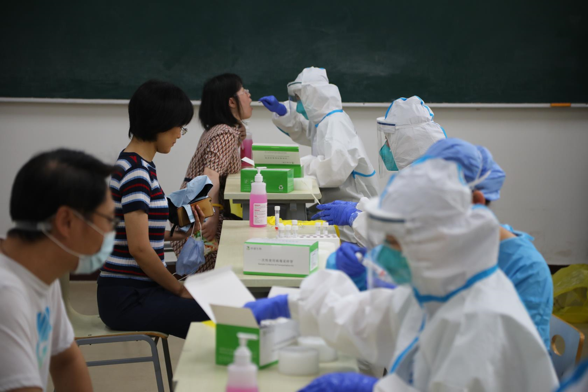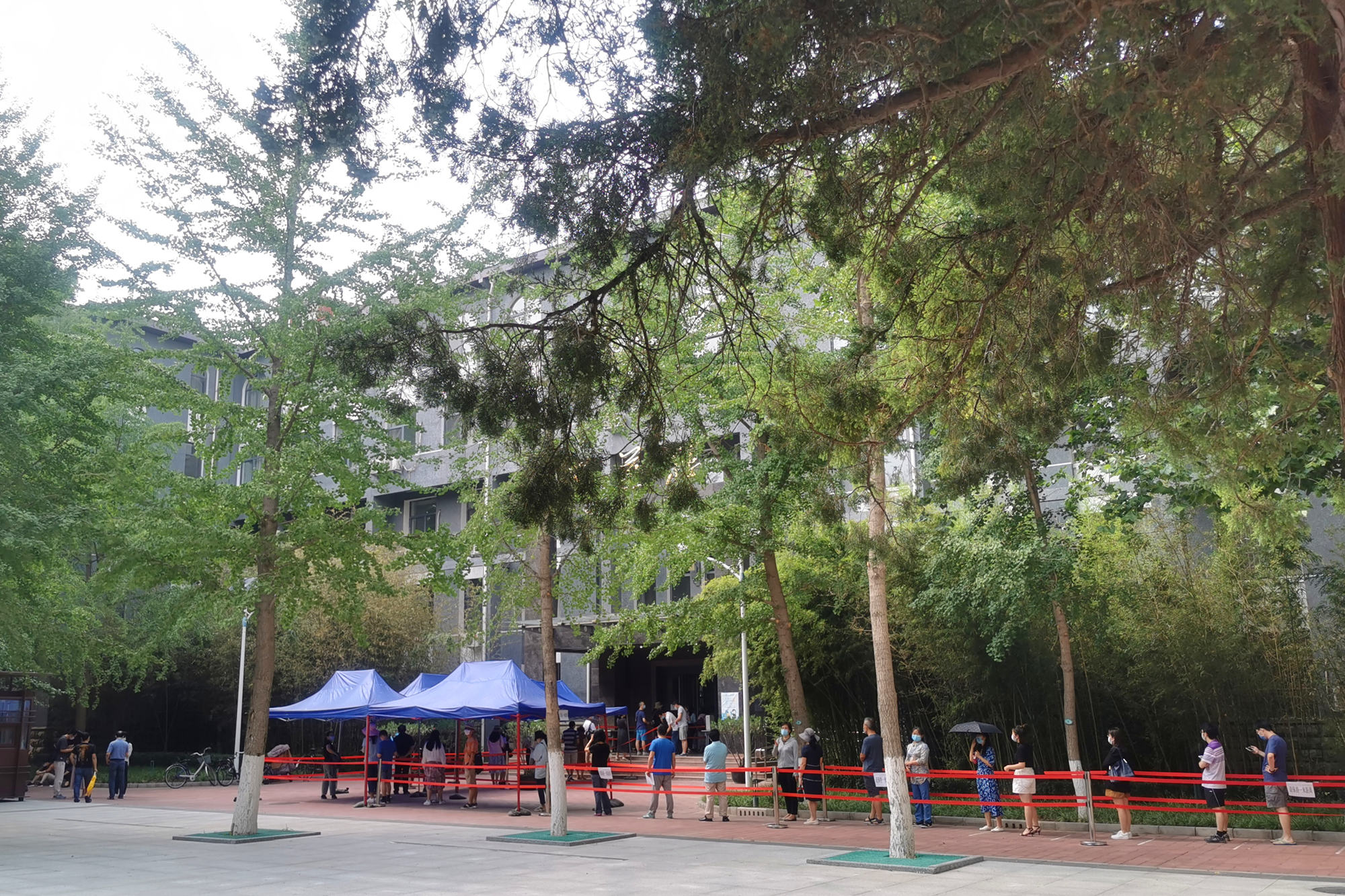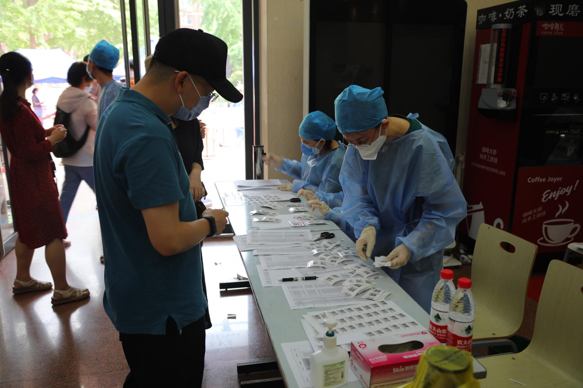 6月27日下午,根据北京市委教工委相关部署安排,落实“应检尽检”要求,ac米兰组织教职员工在闻道楼一层大厅进行核酸检测,学校领导李华东、吴万雄到现场检查工作情况。本次核酸检测由北京世纪坛医院医护人员负责完成,共有374名教职员工参加检测。