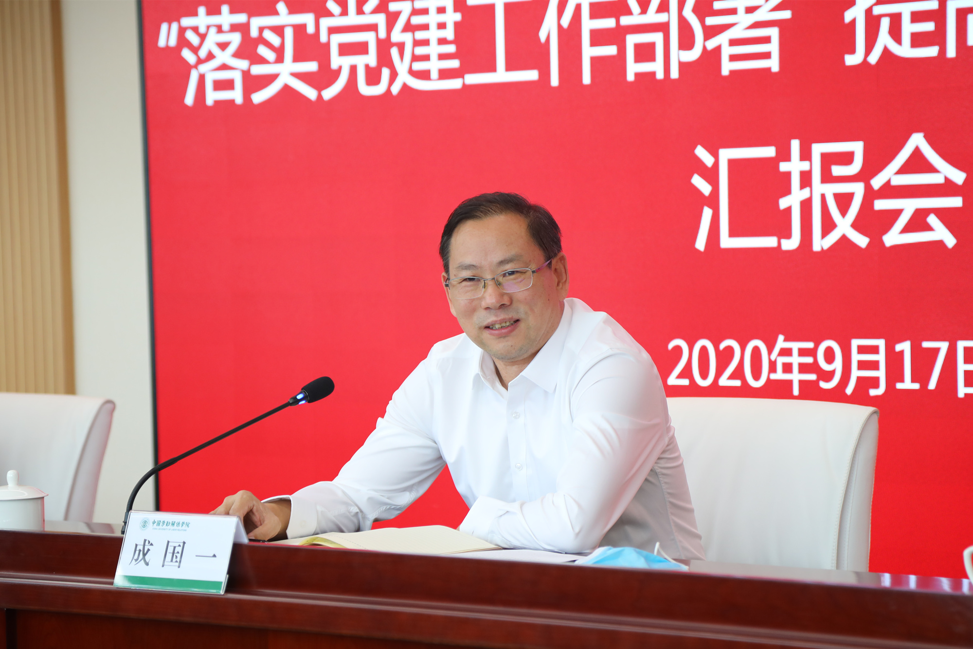 成国一书记高度肯定了学校党建工作的做法和成效,认为学校党建工作特色鲜明、亮点突出、效果明显,是全总机关党建工作的旗帜。他对学校下一步更好地开展党建工作提出四点建议:一是要把握正确的政治方向;二是要加强基层党组织建设;三是要处理好党务与政务的关系;四是要做好党风廉政工作。他希望,学校党委在全总党组的领导下,团结带领师生员工,不忘建校初心,坚守劳动情怀,开创学校改革发展新局面。